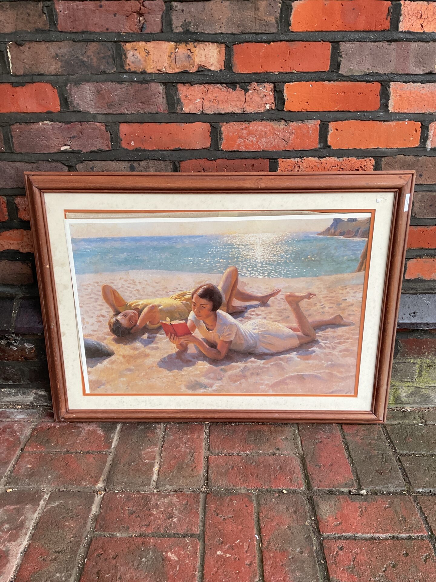 This is a large framed print by Harold Harvey (1874-1941), depicting a serene beach scene with girls reading. The artwork captures a moment of leisure and tranquility, showcasing Harvey’s skill in capturing light and atmosphere. The print is beautifully composed, with a focus on the figures and the gentle curve of the shoreline. It evokes a sense of nostalgia and timelessness, making it a charming addition to any home.
