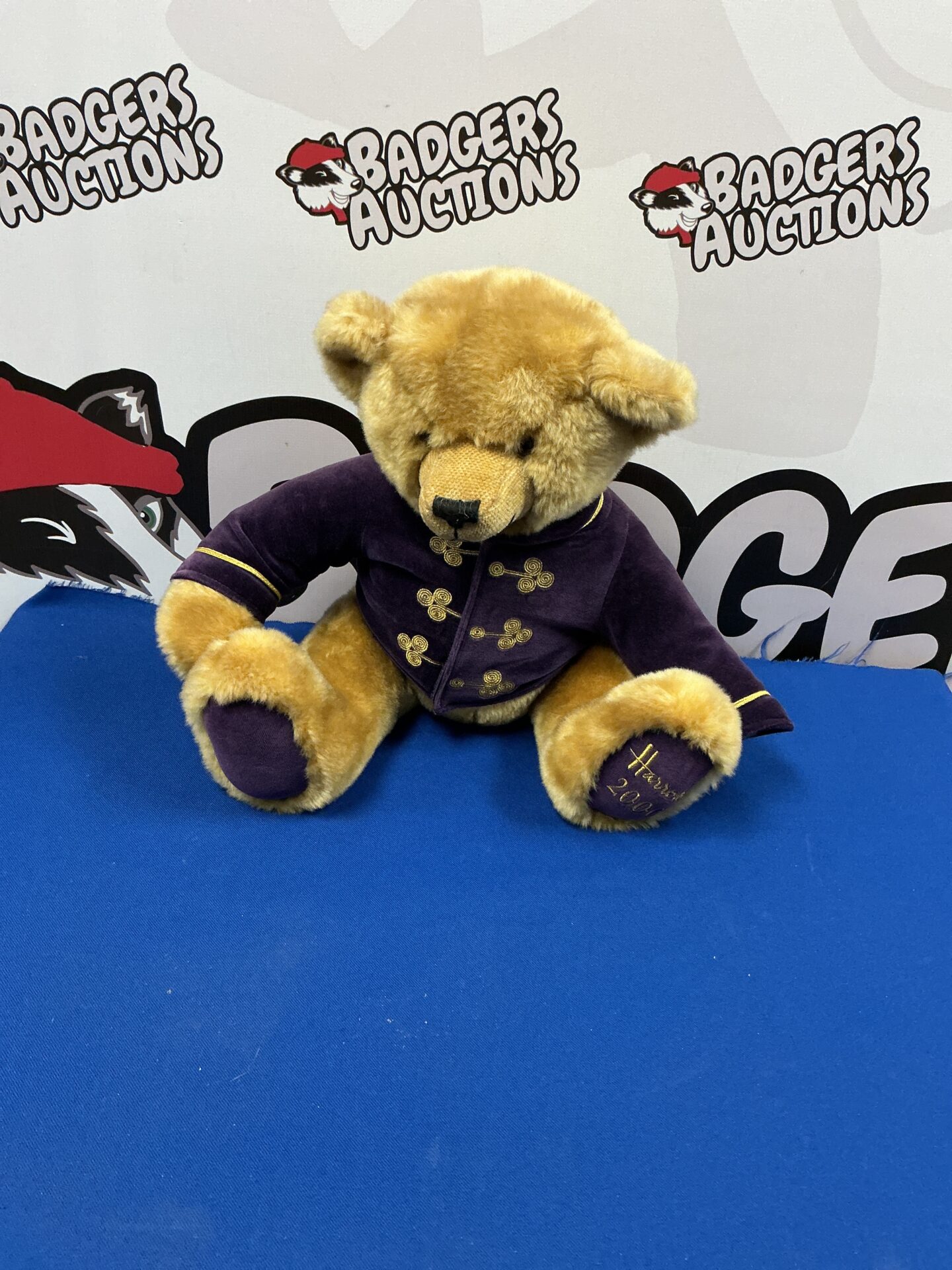 This charming teddy bear is a Harrods 2000 commemorative plush, instantly recognisable by its distinctive uniform. The bear is crafted from a soft, high-quality plush material and features the iconic Harrods green and gold detailing, including a jacket with gold braiding and a Harrods tie. This collectible bear is a delightful piece of Harrods history, designed to evoke nostalgia and charm.