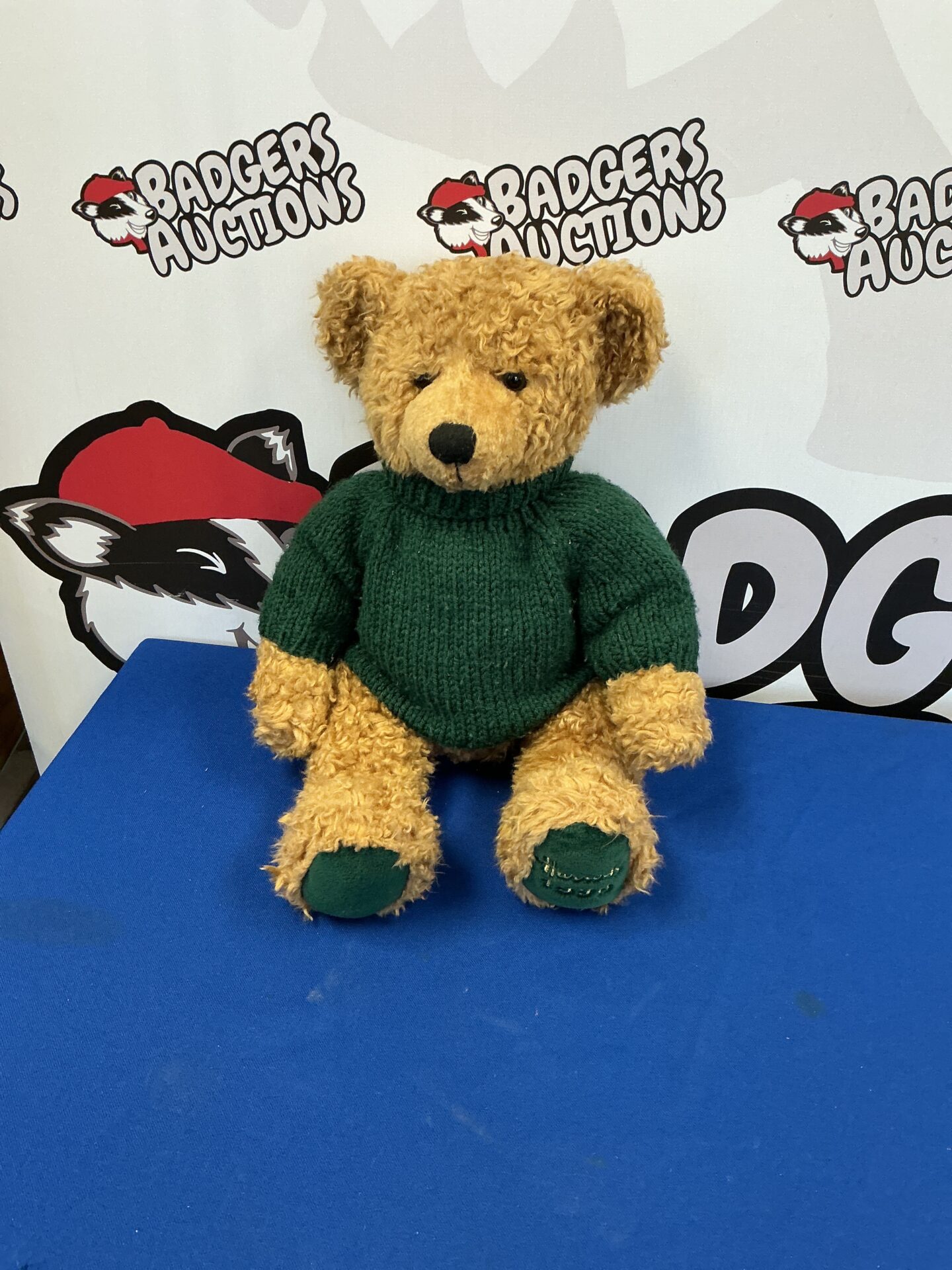This is a charming 1998 Harrods Teddy Bear, a classic collectible plush toy. Crafted with soft, golden-brown plush and featuring a distinguished green jacket, this bear embodies the quality and tradition associated with the renowned Harrods department store. The bear has a traditional design with a sweet expression and a fully jointed body, allowing for various poses.