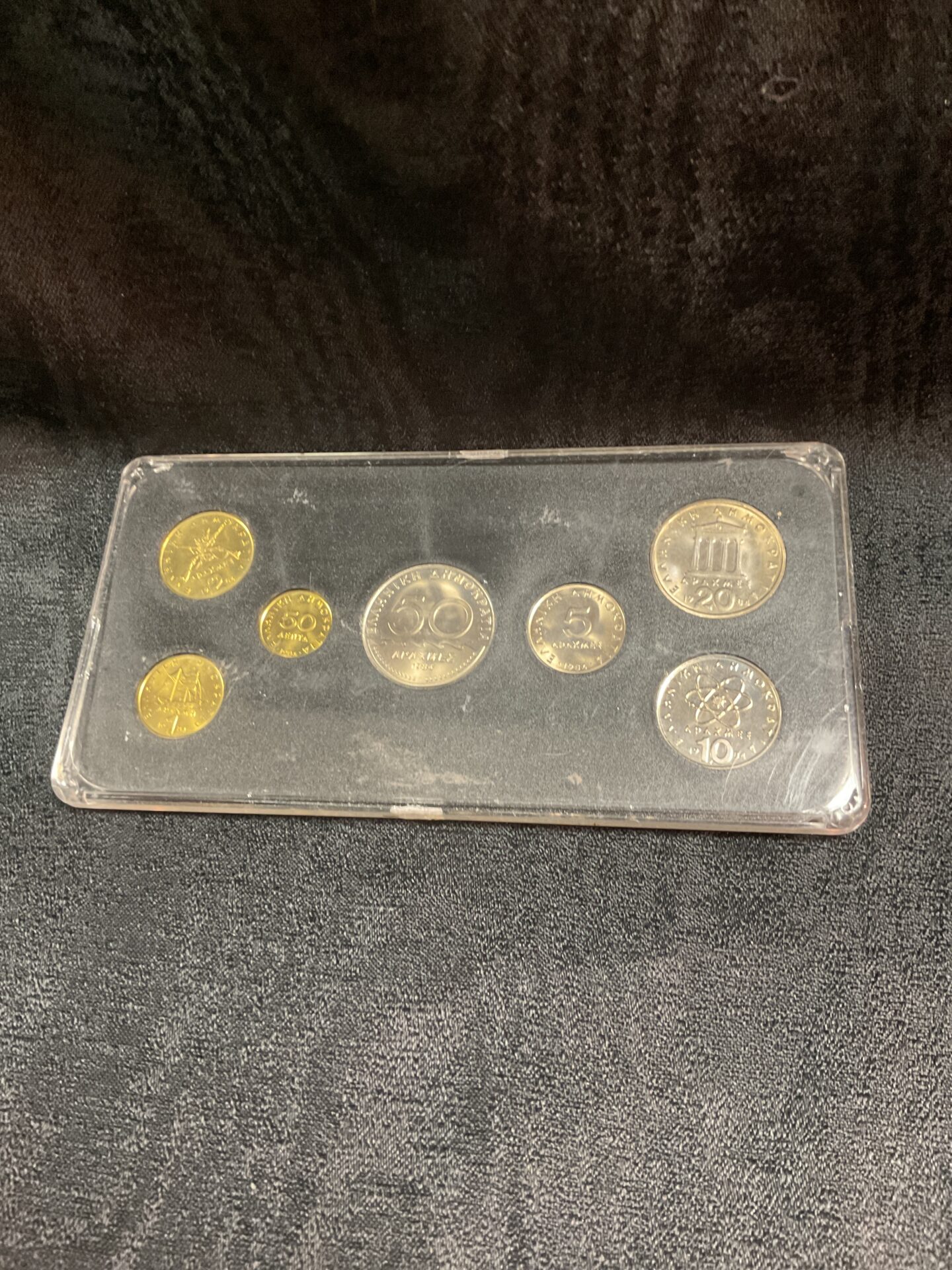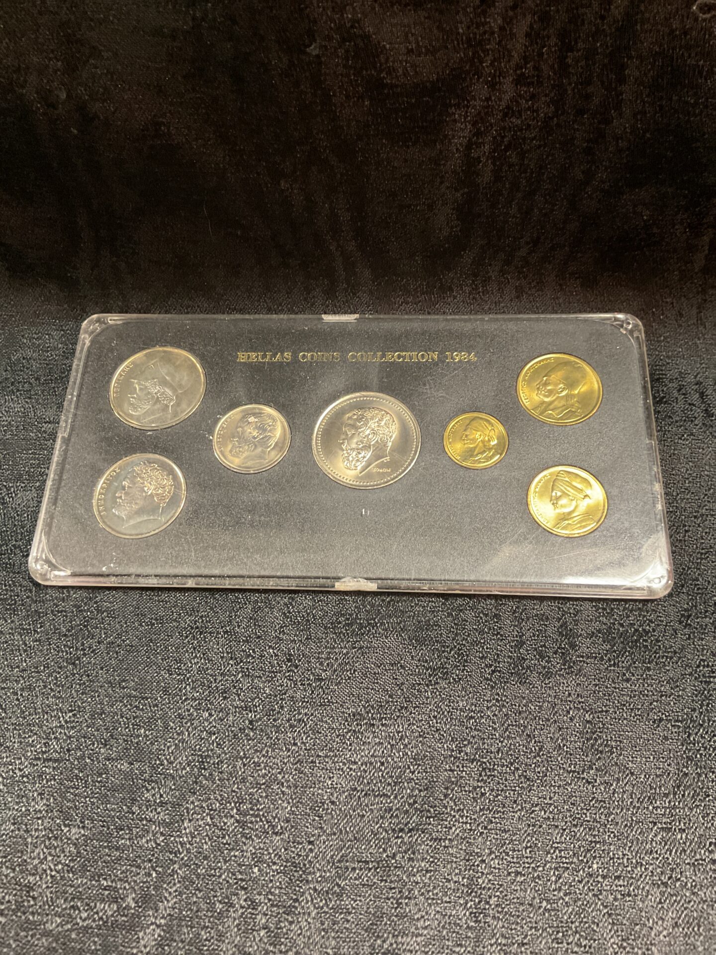 This is a complete Hellas (Greece) coin collection from 1984, presented in a clear plastic holder. The collection features a variety of denominations, showcasing the designs and currency of Greece during that year. The coins are visually appealing, with a golden hue, and the protective case allows for easy viewing and preservation.