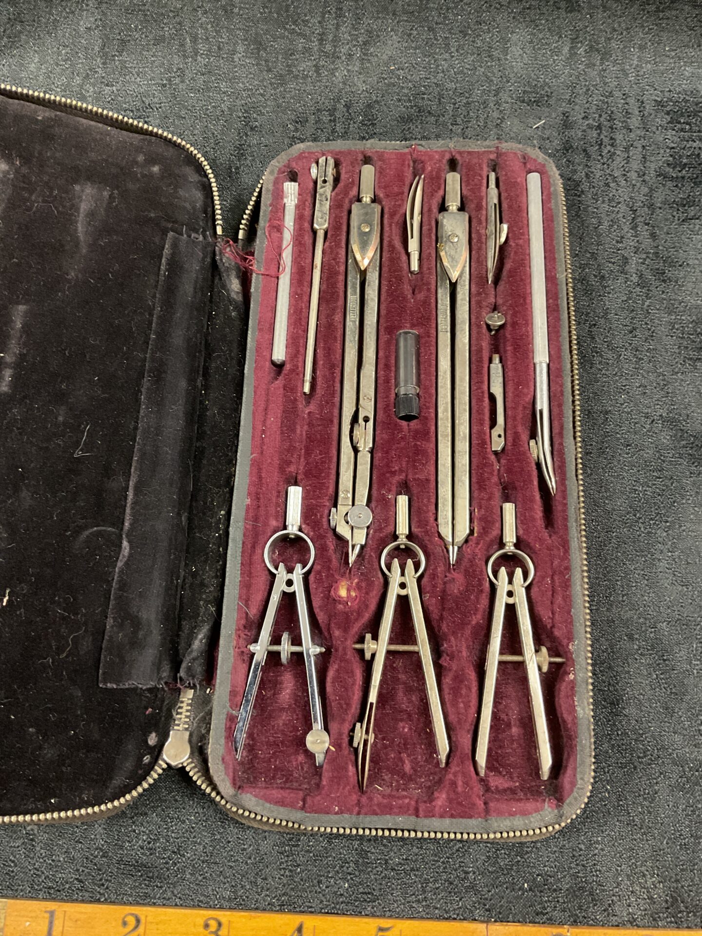 The set appears to show signs of age and use, with some minor surface wear and patina consistent with its vintage. The instruments are presented as found, and their functionality is not assessed. This set would be of interest to collectors of vintage drafting tools, technical drawing enthusiasts, or those seeking to add a piece of design history to their collection.