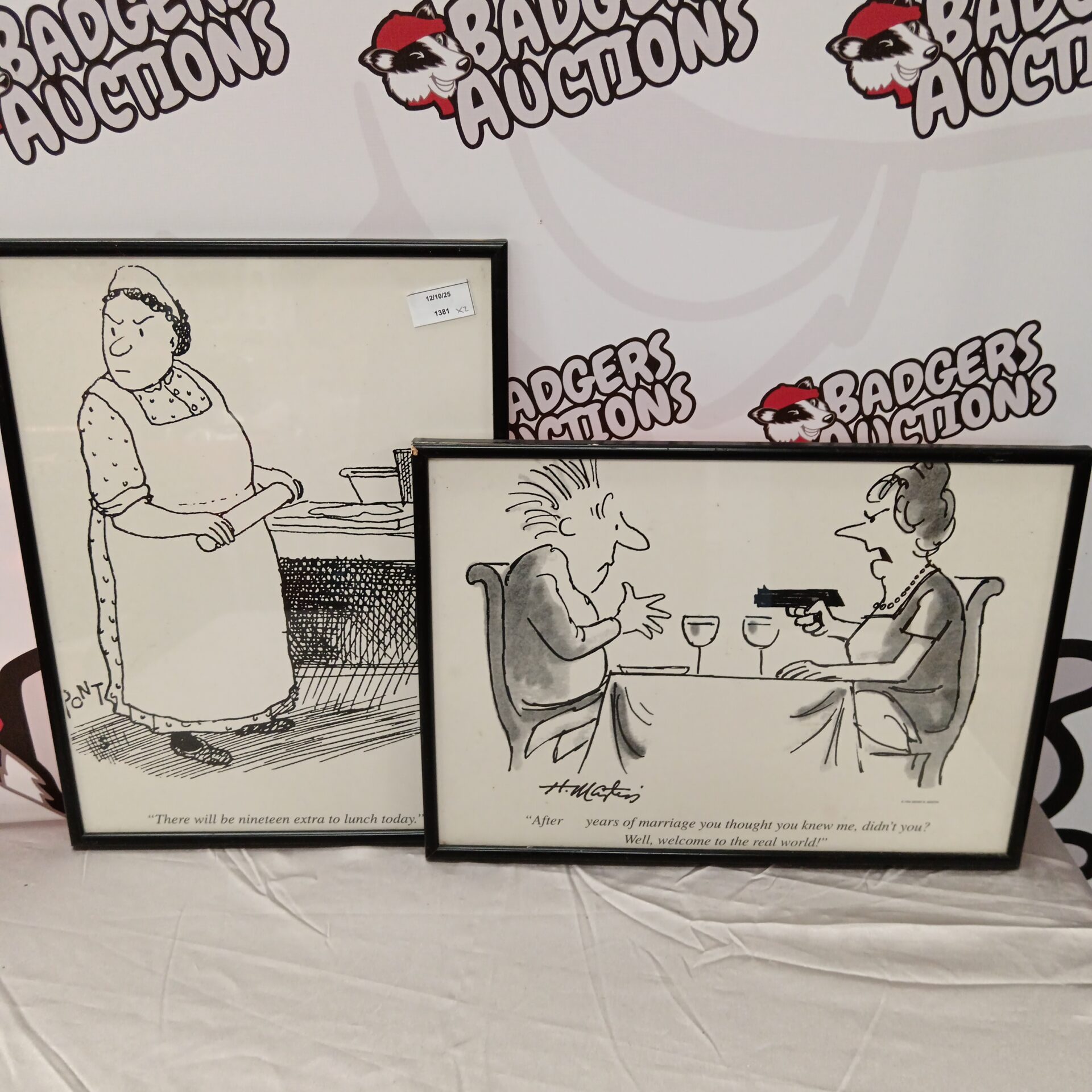 This delightful pair of framed prints showcases the work of Henry R. Martin, a renowned cartoonist known for his witty and charming illustrations. These prints depict humorous scenes, likely dating from the mid-20th century, and are presented in simple, yet elegant frames, enhancing their vintage appeal. The style is classic cartooning, with expressive characters and detailed backgrounds, capturing a lighthearted and nostalgic aesthetic.