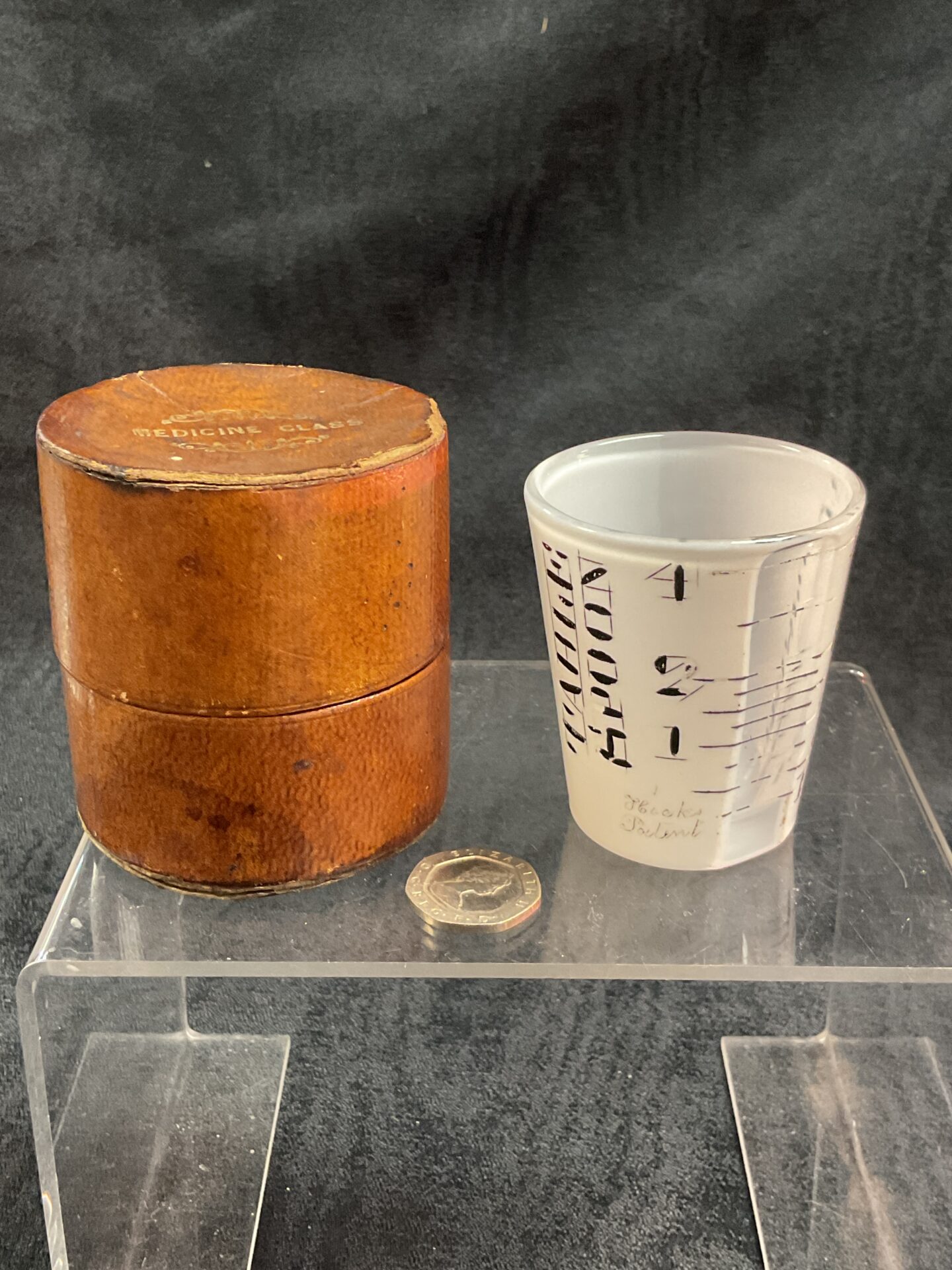 The medicine glass and case exhibit wear commensurate with age, including minor discoloration and surface imperfections. While not pristine, these characteristics contribute to its authenticity and appeal as a collectible item. Collectors of medical antiques, apothecary items, or vintage glassware will find this piece particularly desirable. It offers a glimpse into the history of medicine and pharmacy, and serves as a unique conversation starter.
