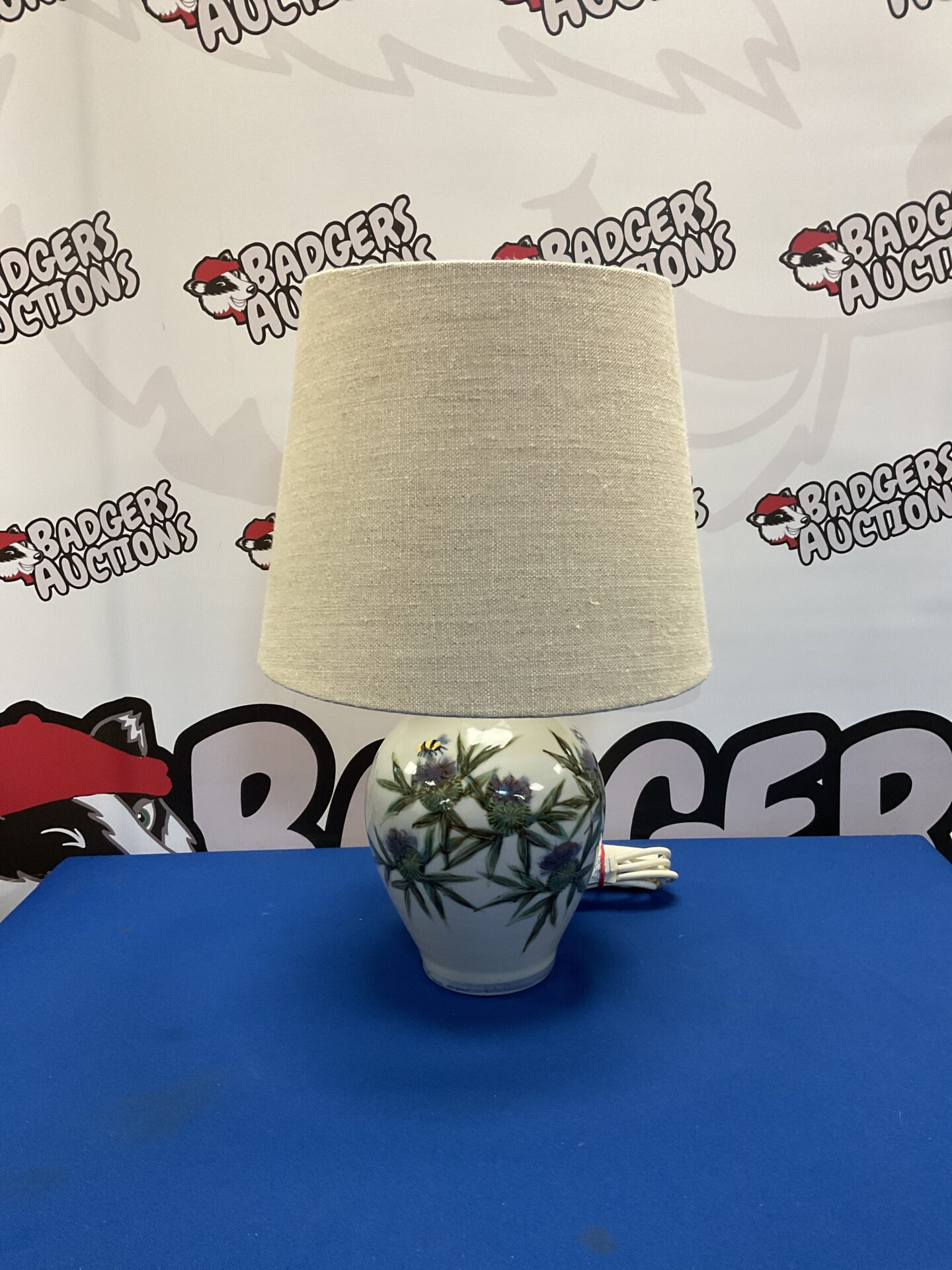 This is a charming Highland stoneware table lamp, beautifully decorated with a detailed thistle and bee pattern. The lamp features a classic ceramic base, showcasing the artistry of Scottish pottery. The design evokes a rustic, natural aesthetic, making it a delightful addition to any home décor.