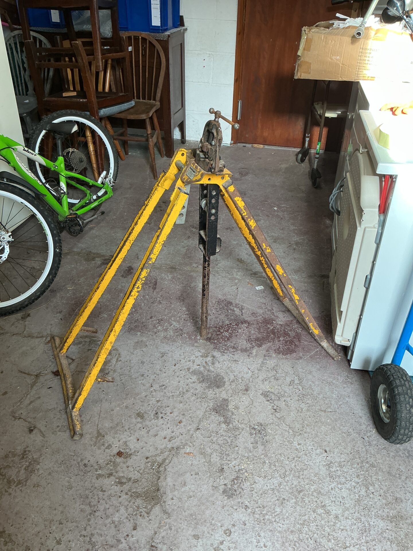 This Hilmor pipe bending stand is presented in used condition, showing signs of wear consistent with workshop use. The paintwork exhibits some scuffs and marks, and there may be minor corrosion present. Despite this, the stand appears structurally sound and could be a useful addition to a plumber’s or metalworker’s toolkit, or of interest to a collector of vintage tools.