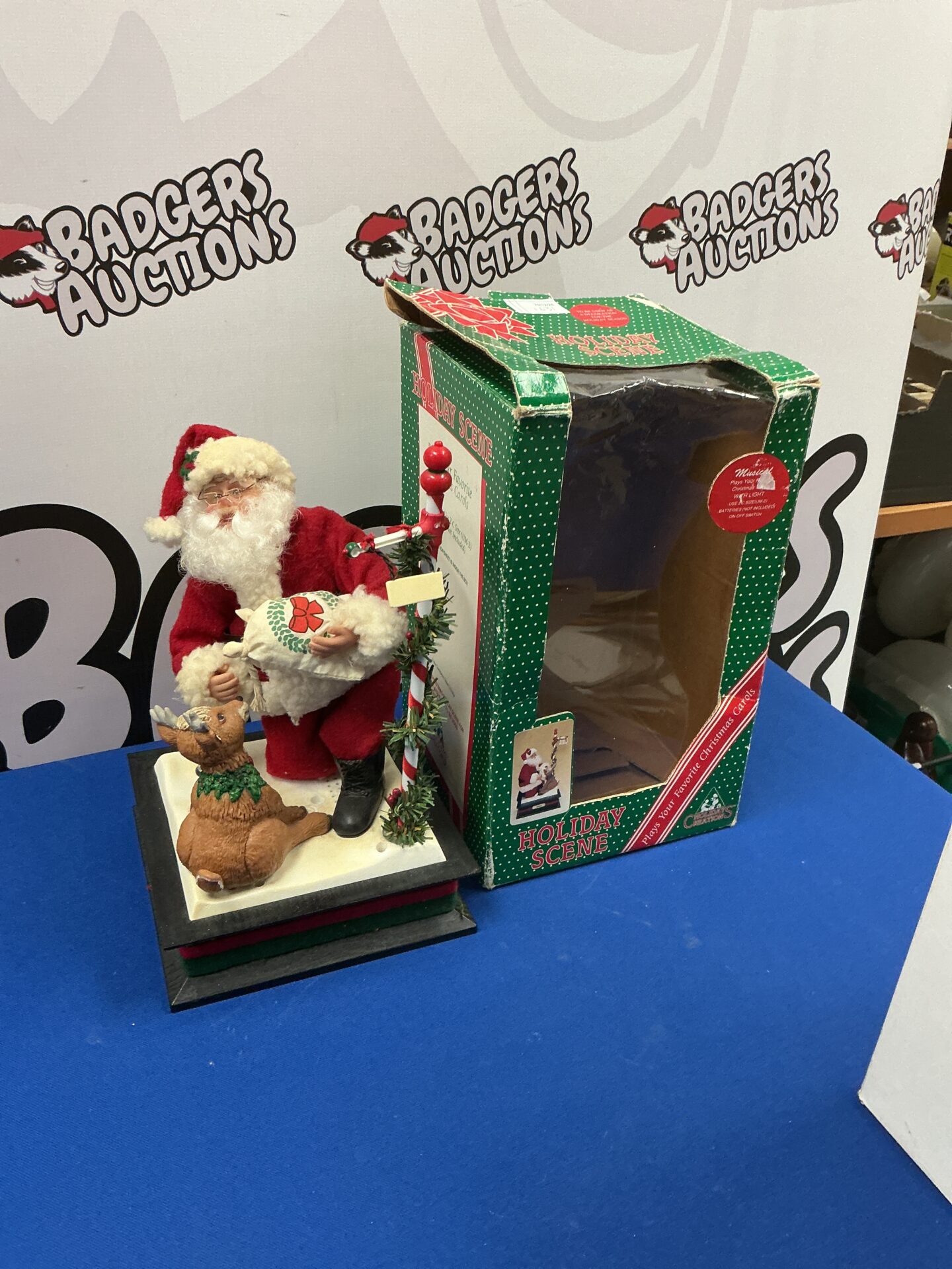 This charming figurine depicts a festive Christmas scene, featuring a Santa Claus figure. The figurine is designed to light up and play music, adding a delightful touch to any holiday display. Its construction appears to be a combination of plastic and fabric elements, creating a visually appealing and nostalgic piece.