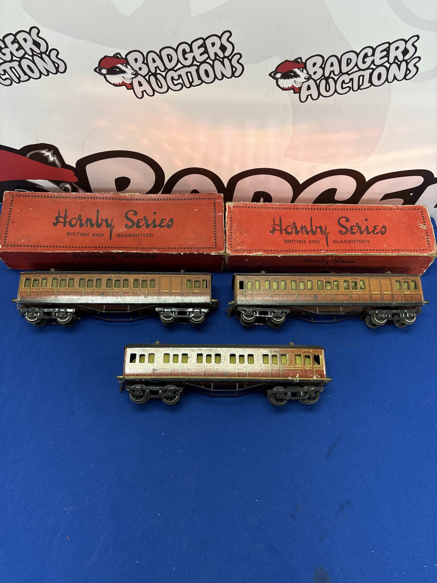 343 Three Vintage Hornby Series O Gauge Carriages With Two Boxes