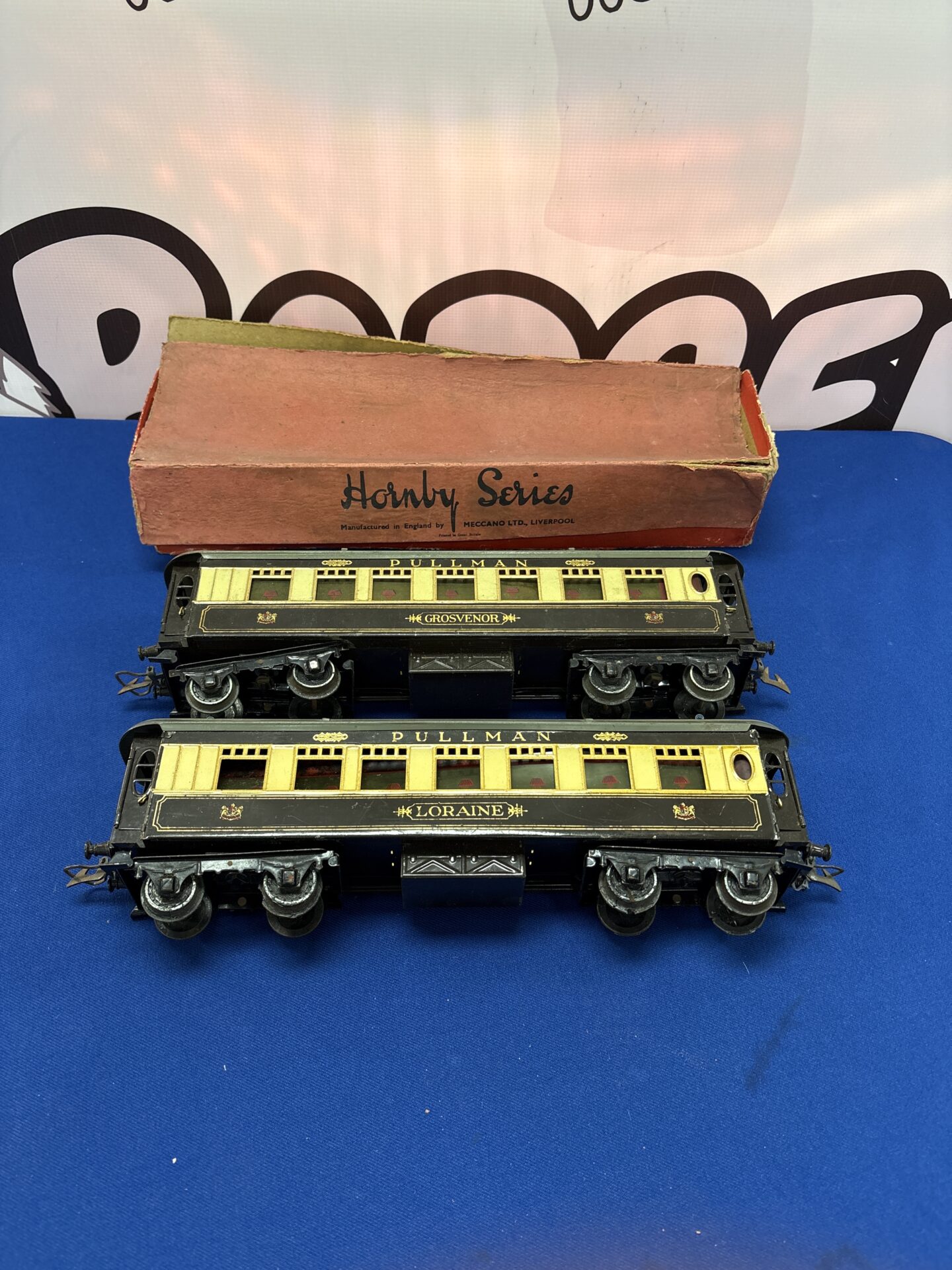 This is a vintage Hornby Series O Gauge Pullman carriage, a beautifully crafted example of early 20th-century model railway engineering. Constructed with traditional tinplate, this carriage showcases the iconic design of the Pullman cars that graced the railways of the era. The carriage features detailed exterior panelling, and classic wheels, reflecting the quality and craftsmanship of Hornby’s early production.