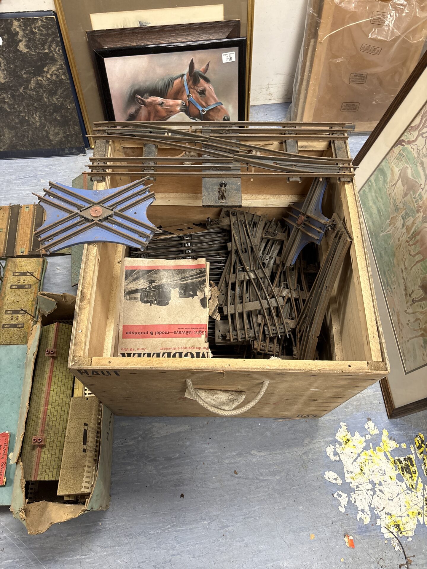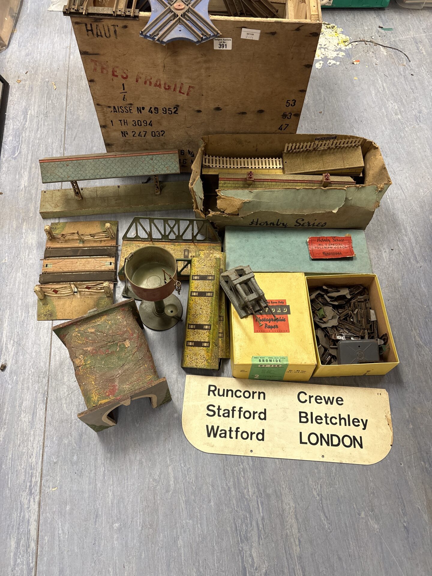 This lot features a large collection of vintage Hornby Series O gauge track and accessories. Ideal for model railway enthusiasts and collectors, this collection offers a substantial quantity of original pieces. The track and accessories show signs of age and wear, presenting a restoration project or expansion opportunity.