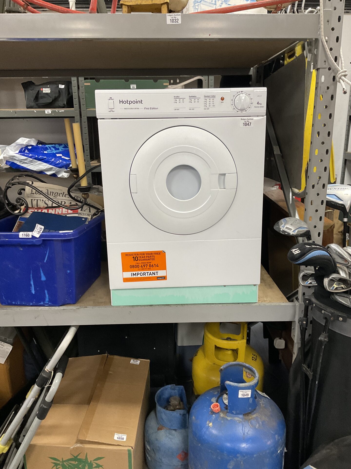 This is a Hotpoint V4D01P tumble dryer, a domestic appliance designed for drying clothes. It appears to be a condenser dryer, meaning it collects water as part of the drying process. The dryer features a white finish and standard controls for temperature and cycle selection.