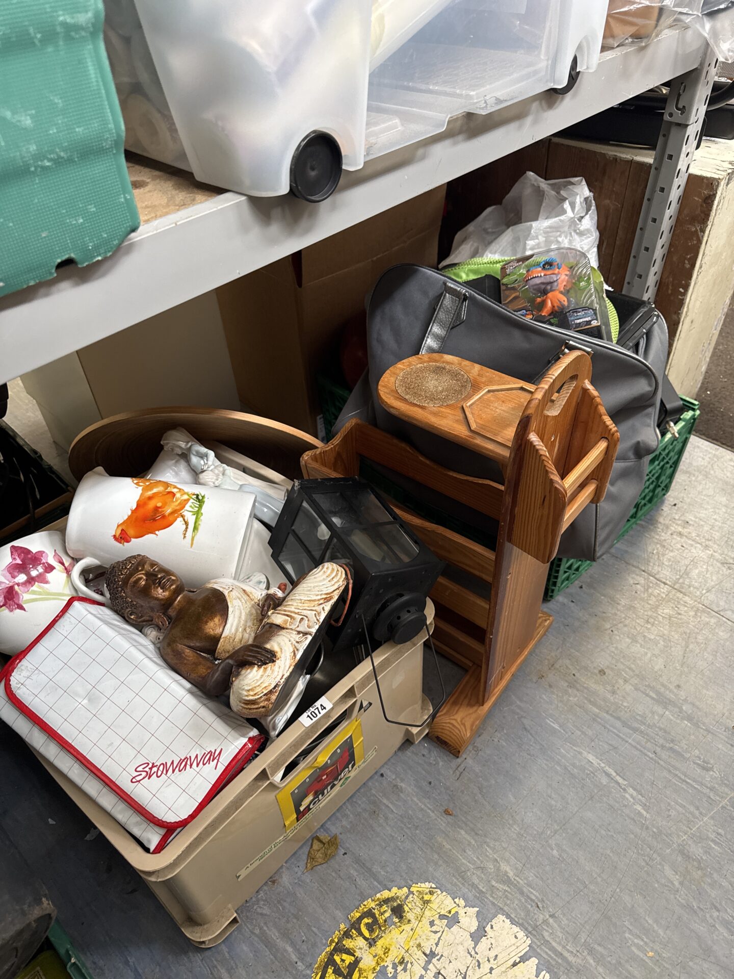 This lot comprises a diverse collection of items recovered from a house clearance. It includes a wooden folding step ladder, a patterned cushion, a decorative plate, a storage box containing various items, and a canvas bag. The lot presents a varied assortment of household goods, potentially including vintage or collectible pieces.