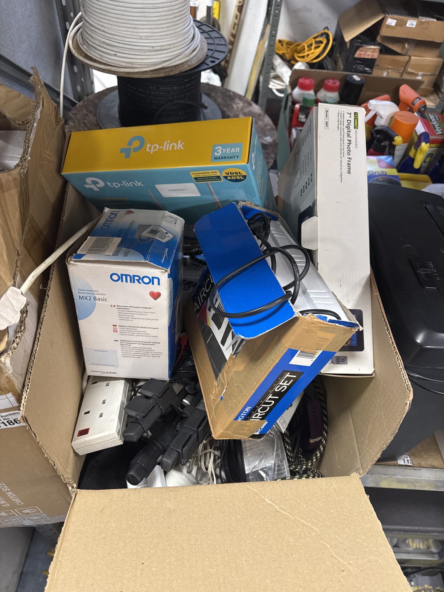 This is a mixed lot of household items, appearing to be from a house clearance. The lot includes a TP-Link networking device, various cables, and other electrical accessories. The contents are varied and may appeal to those seeking spare parts, repair projects, or simply a collection of miscellaneous items.