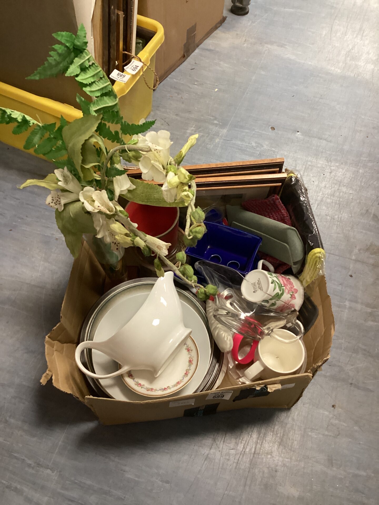 689 Box Of House Clearance Inc Gravy Jugs, Artificial Flowers In Vase &picture Frames