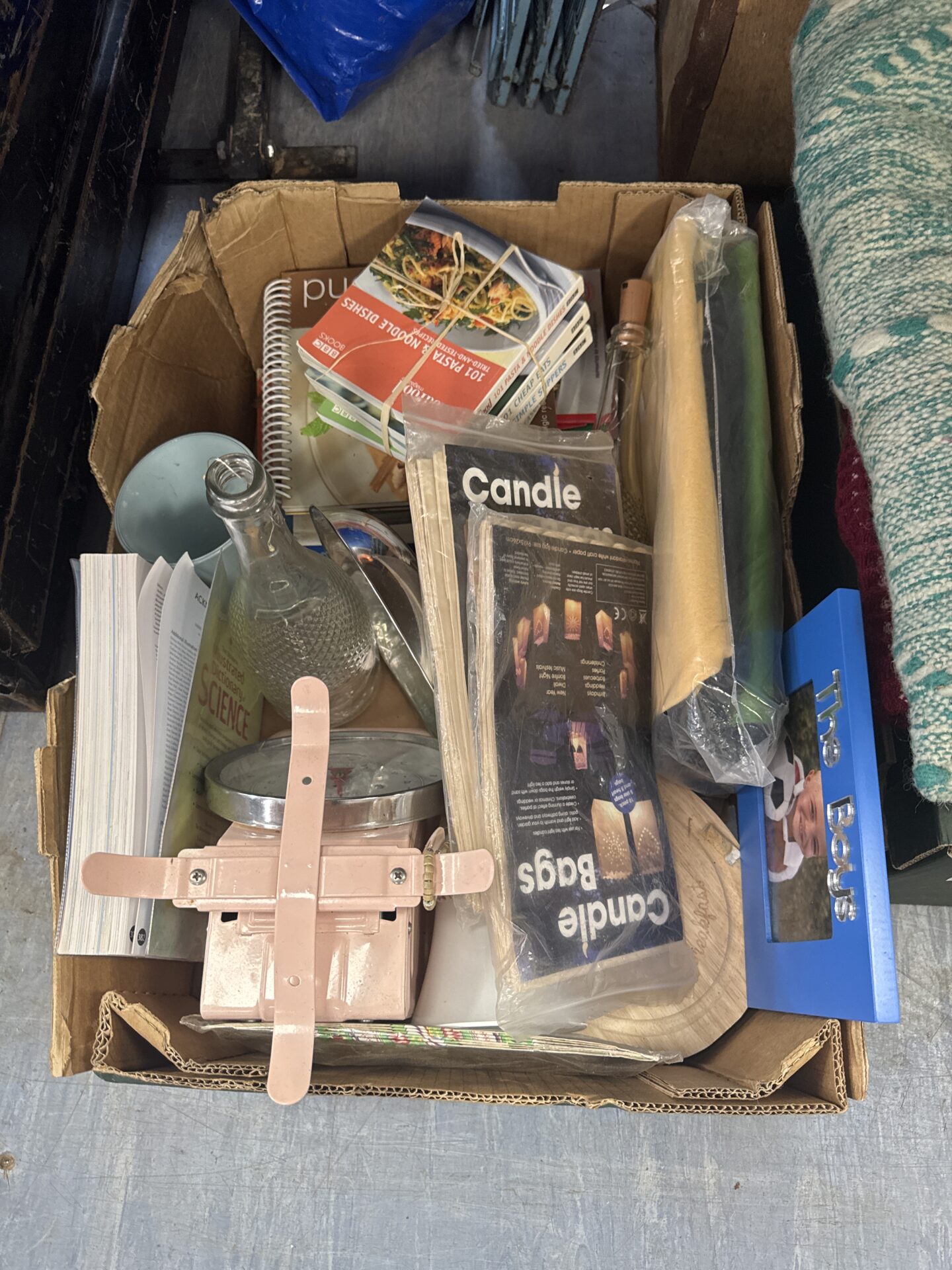This is a mixed lot salvaged from a house clearance, containing a variety of items. It includes what appears to be a small wooden stand, a collection of vintage magazines (possibly related to pasta dishes), a small metal tray, and other miscellaneous household effects. The lot offers a glimpse into a previous owner’s life and interests, presenting a diverse range of objects from different eras.