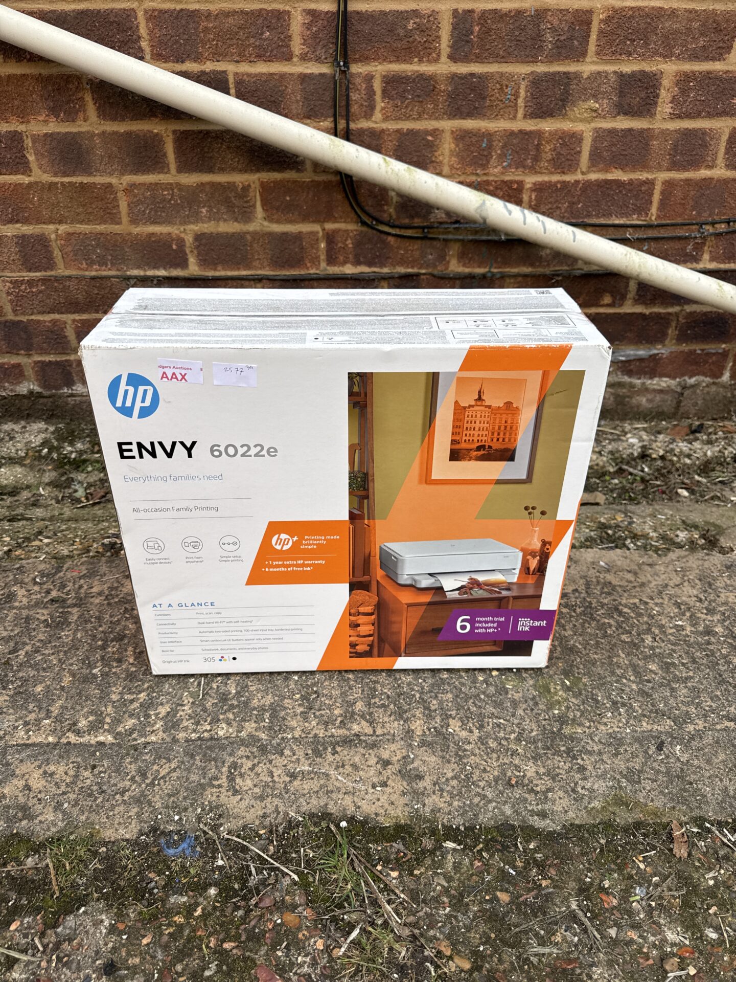 This HP Envy 6022e appears to be new in its original, unopened packaging. It may be of interest to collectors of vintage or modern technology, or to those seeking a spare printer for parts or restoration. The pristine condition of the packaging suggests it has been carefully stored.