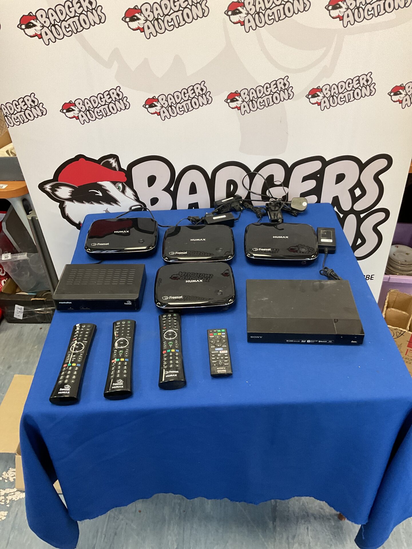 This lot comprises a collection of Humax freesat boxes, alongside a Manhattan box and a Sony Blu-ray player. These devices represent a range of home entertainment technology, offering access to digital satellite television and Blu-ray disc playback. The collection provides a variety of options for enjoying media content at home.