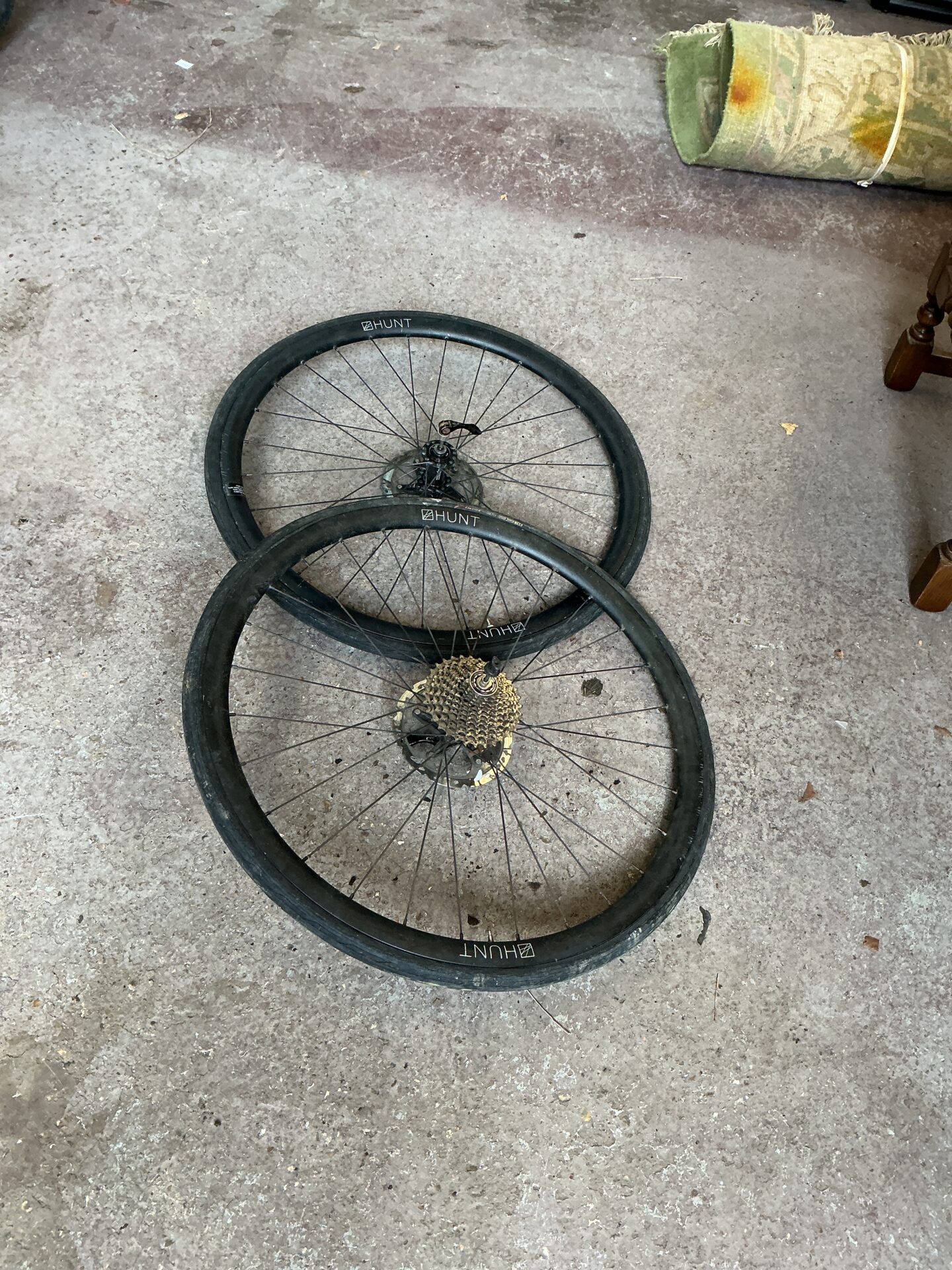This listing features a pair of Hunt bike wheels. These wheels appear to be designed for road or gravel cycling, featuring a sleek black finish and a disc brake compatibility. The wheels are constructed with a focus on performance and durability, suitable for a range of riding conditions.
