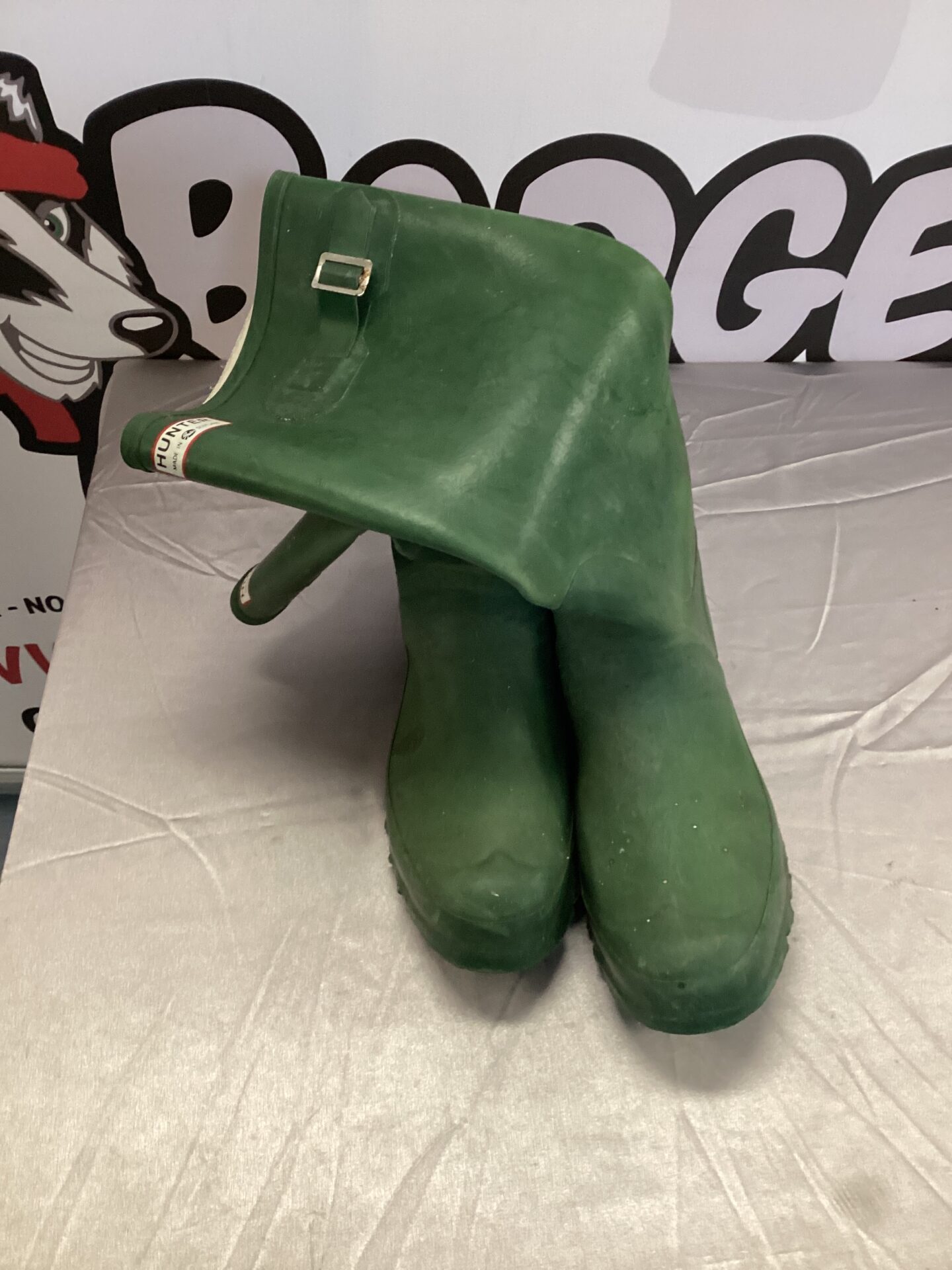 These Hunter Wellington boots show signs of previous use, with some wear and tear consistent with outdoor footwear. They remain structurally sound and functional, offering continued use or potential restoration. The classic design and brand recognition make these boots appealing to collectors of outdoor gear and fashion enthusiasts.