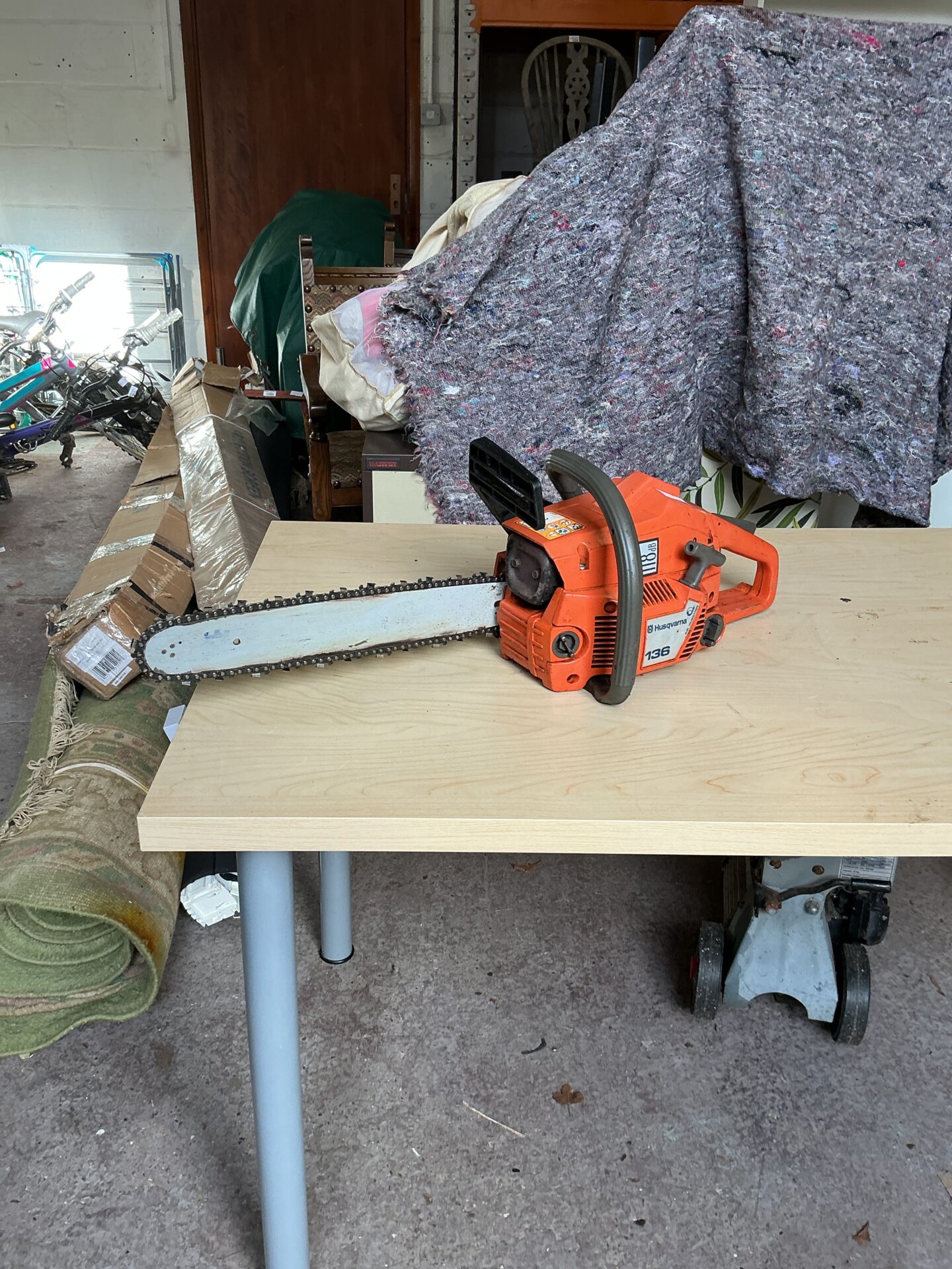This Husqvarna 136 chainsaw is presented for auction in used condition. Please examine the images carefully to assess its condition. It may be of interest to collectors of vintage or classic garden tools, or to those seeking a project to restore a functional chainsaw.