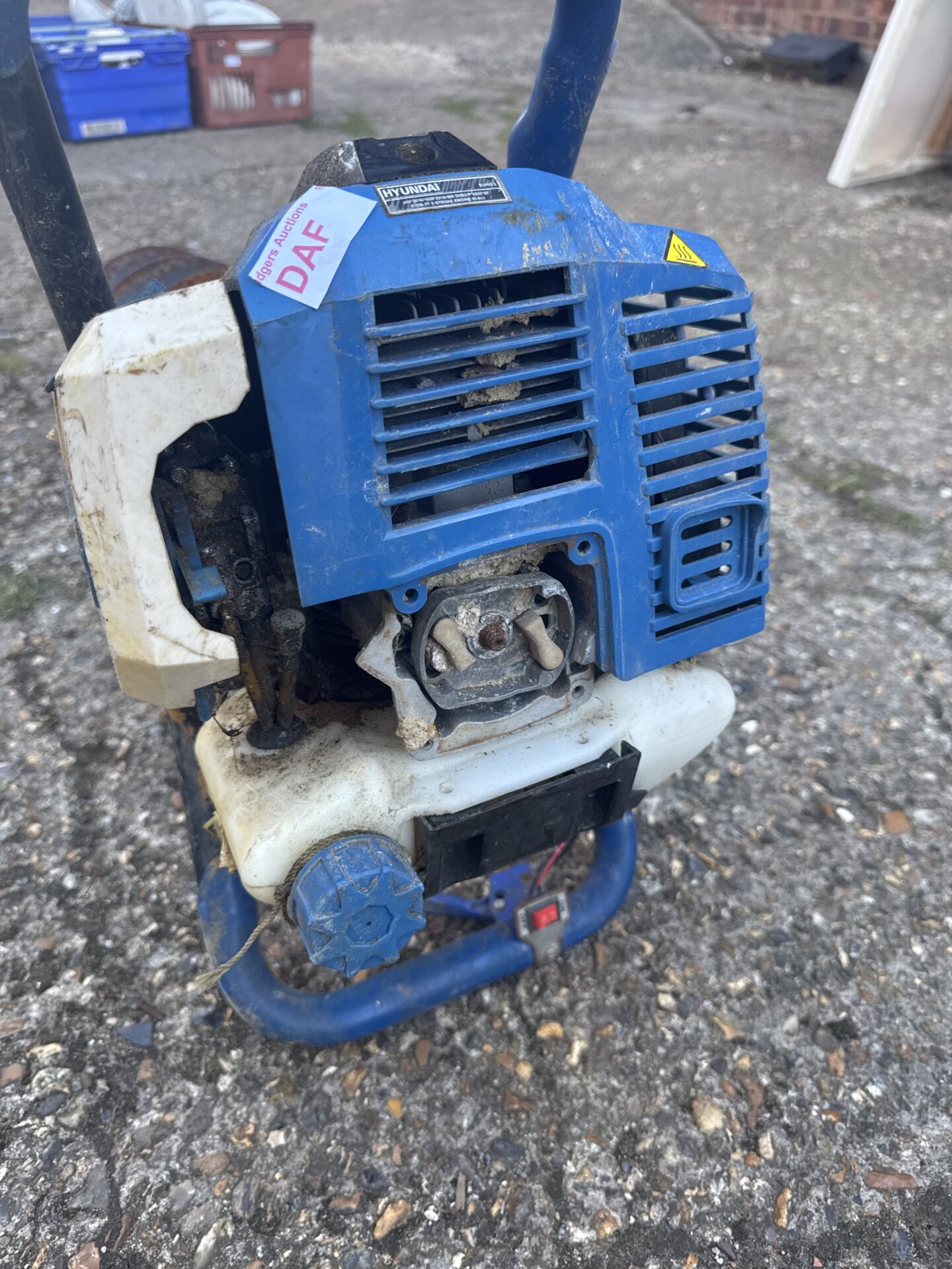 This post hole borer is offered for spares or repairs, as it is missing a cover. While not in full working order, it presents an opportunity for someone with mechanical skills to restore it to its former glory. It could also be a useful source of parts for another similar machine. The Hyundai brand is known for its reliable garden tools, making this a potentially valuable item for enthusiasts or those needing specific components.