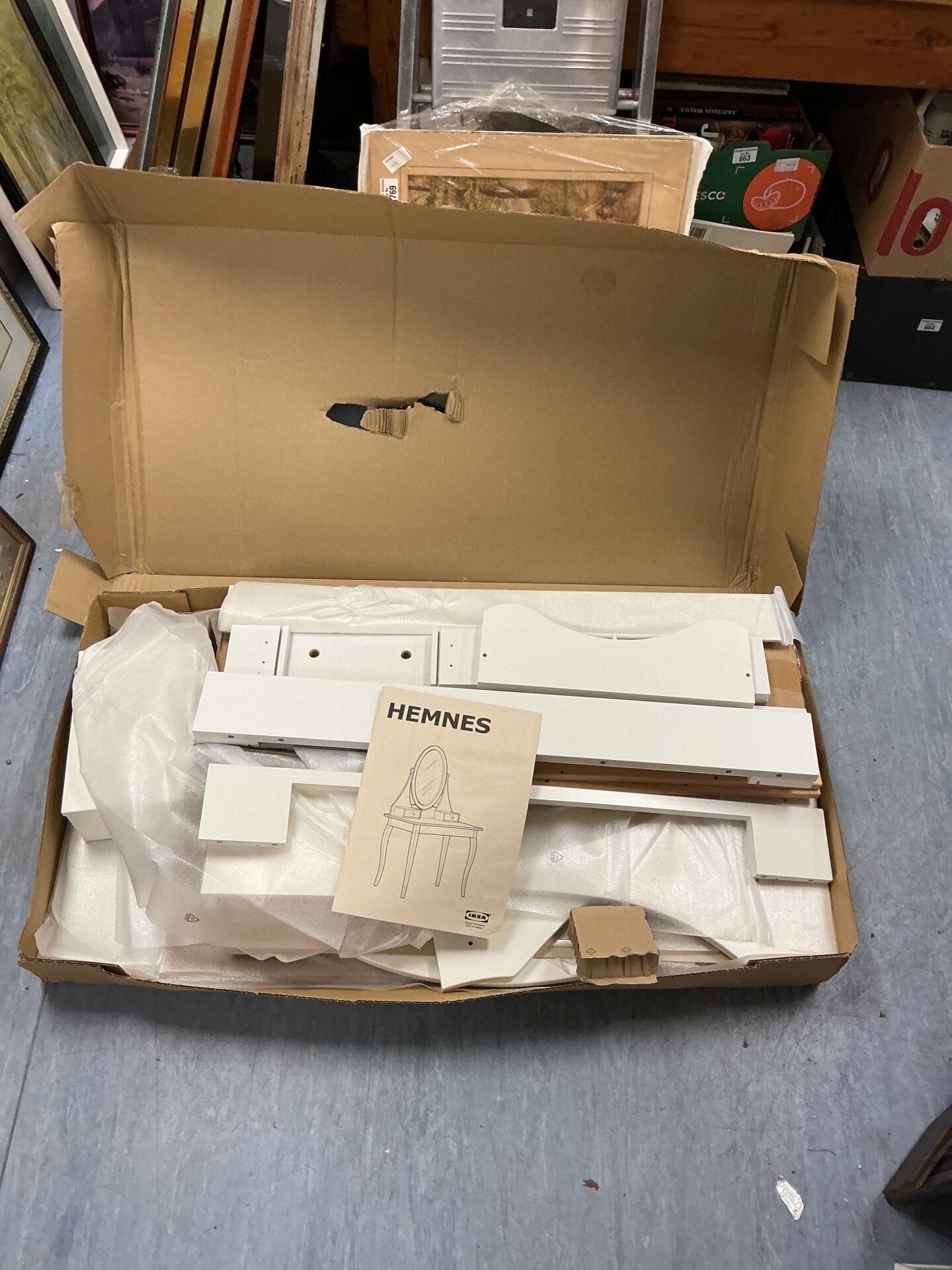 This dressing table is offered in its original, unopened flat-pack packaging. The condition of the components within is unknown, as the box has not been inspected. This makes it potentially interesting for those who enjoy the process of assembling furniture or for those seeking a project.