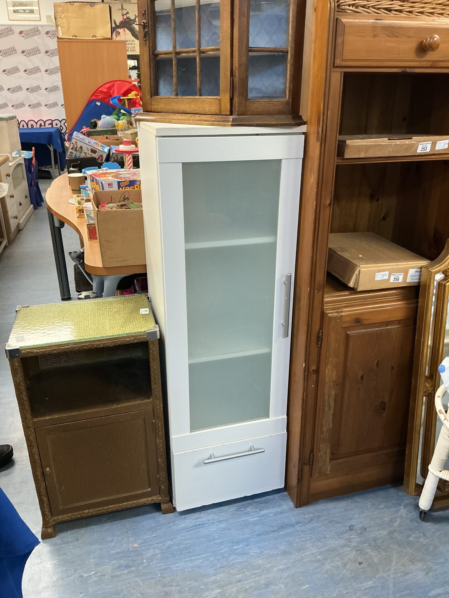 This is a white Ikea cabinet featuring a glass front, offering a modern aesthetic for display or storage. The cabinet’s design incorporates clean lines and a minimalist style, typical of Ikea’s functional and contemporary approach to furniture. It provides a versatile solution for various rooms, suitable for showcasing collectibles, books, or everyday items.