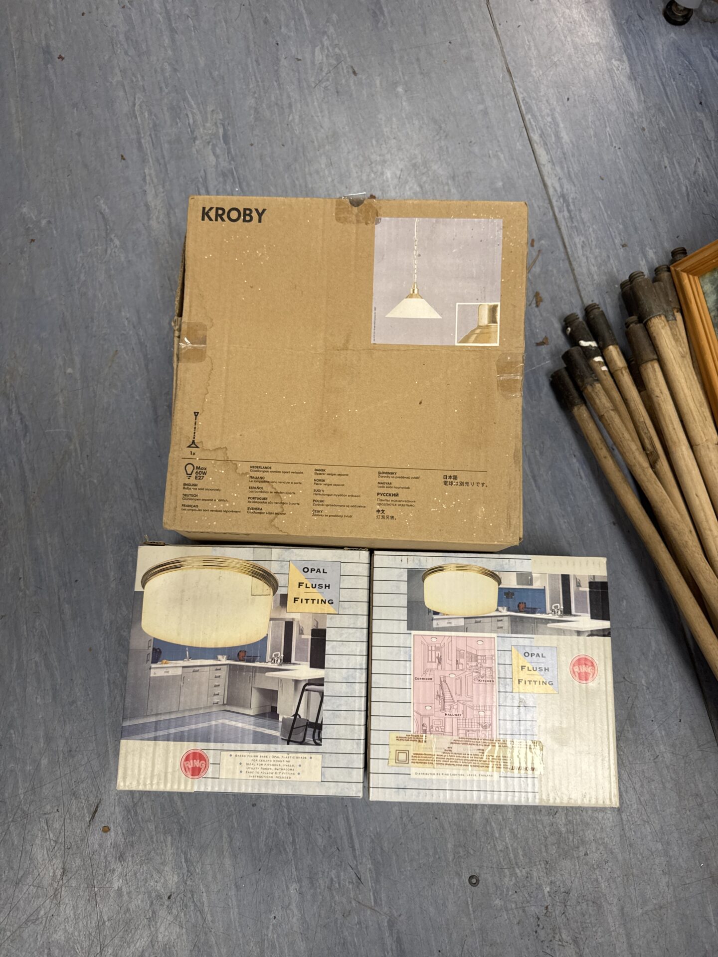 This is an Ikea Kroby ceiling light, featuring an opal glass shade. The Kroby design is a classic mid-century style, offering a soft, diffused light. This light is part of a lot including two ring opal ceiling lights, offering a cohesive aesthetic for a room or project.