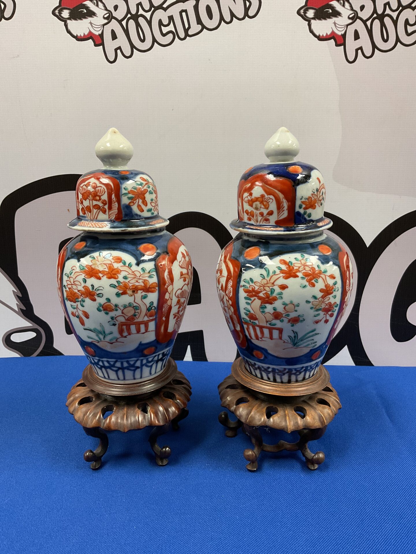 This pair of vintage temple vases showcases the classic Imari pattern, originating from the Arita region of Japan. Crafted from porcelain, these vases feature a vibrant palette of red, gold, and blue, meticulously hand-painted onto a white base. The intricate designs typically depict floral motifs, landscapes, or auspicious symbols, reflecting the rich artistic heritage of the Imari style. These vases are presented on wooden bases, adding to their display appeal and providing stability.