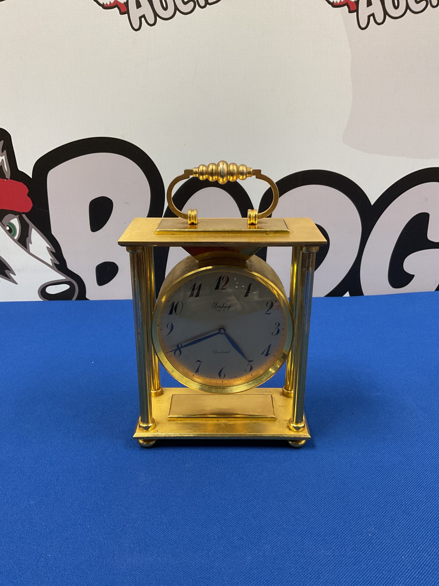 This clock presents as a vintage item with signs consistent with age and previous use. Collectors and enthusiasts will appreciate the clock’s authentic design and the prestige of the Imhof Bucherer brand. This piece would be a welcome addition to a collection of antique clocks or a sophisticated accent piece for a discerning home.