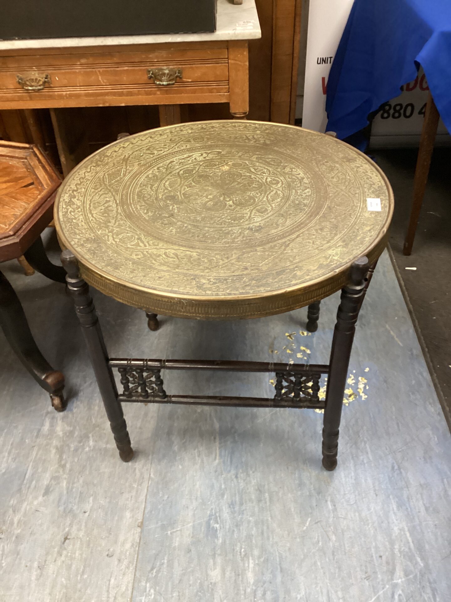 The table is in good vintage condition, with expected wear consistent with age and use. The brass exhibits a lovely patina, enhancing its character. This table would appeal to collectors of Indian artifacts, brassware, or those seeking a unique and eye-catching piece for their home decor. It’s a statement piece that adds warmth and cultural interest to any space.