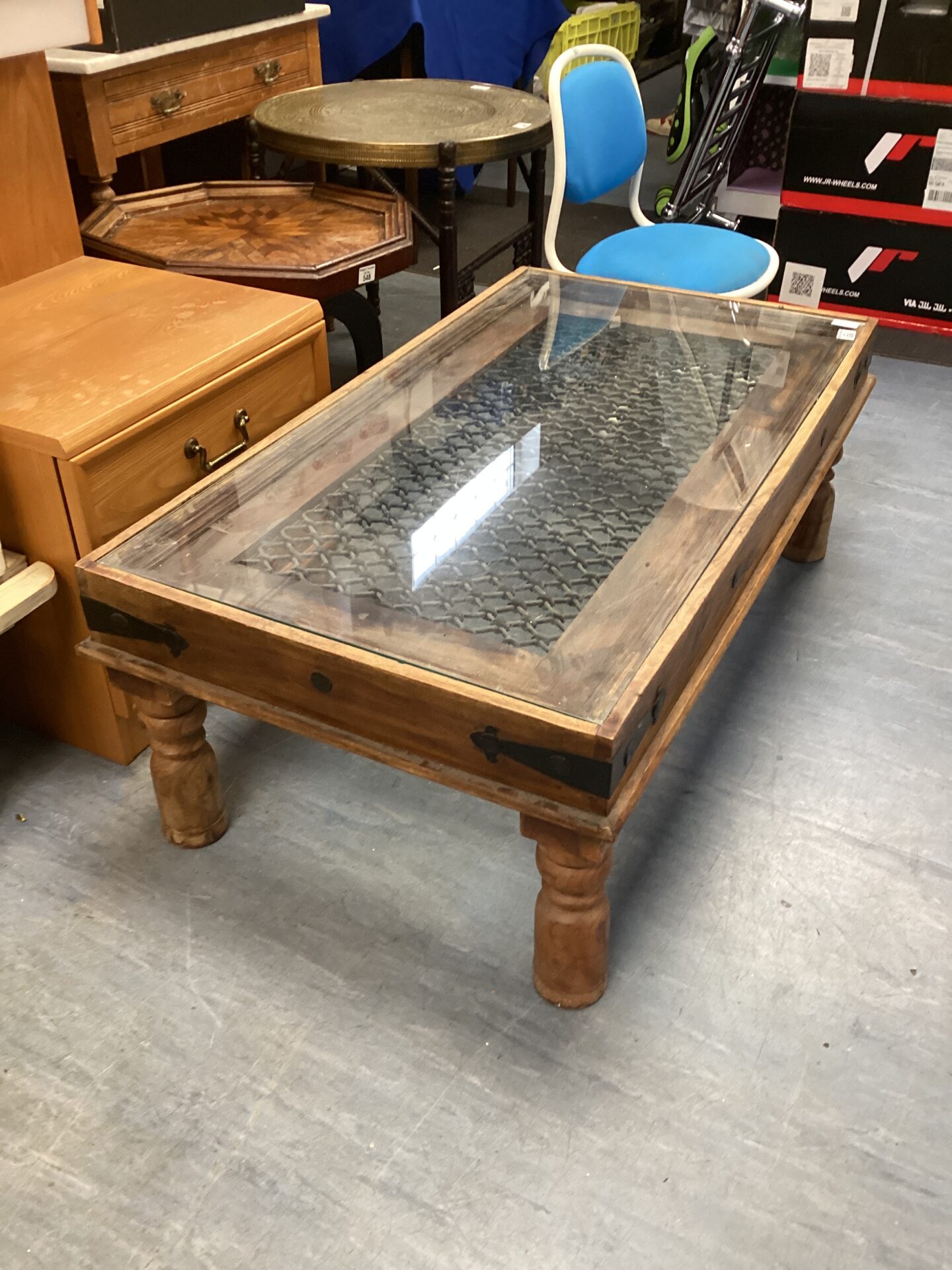 636 Indian Oak Glass Topped Coffee Table With Wrought Iron Lattice