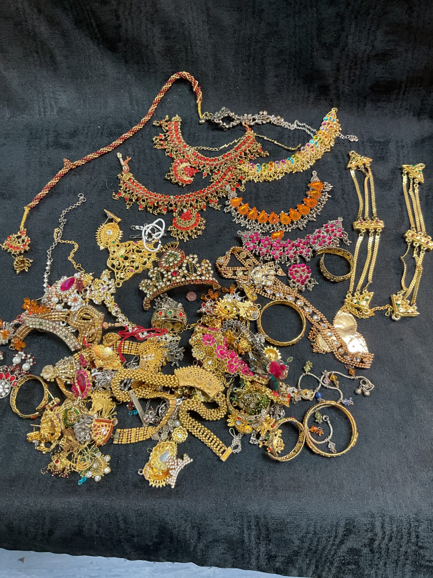 The jewellery appears to be pre-owned, with some pieces showing signs of wear consistent with age and use. While not fine jewellery, this lot offers a fantastic opportunity for collectors of costume jewellery, those interested in Indian culture, or individuals looking for unique statement pieces. The variety and quantity of items make it ideal for resale, theatrical productions, or creating eclectic jewellery arrangements.