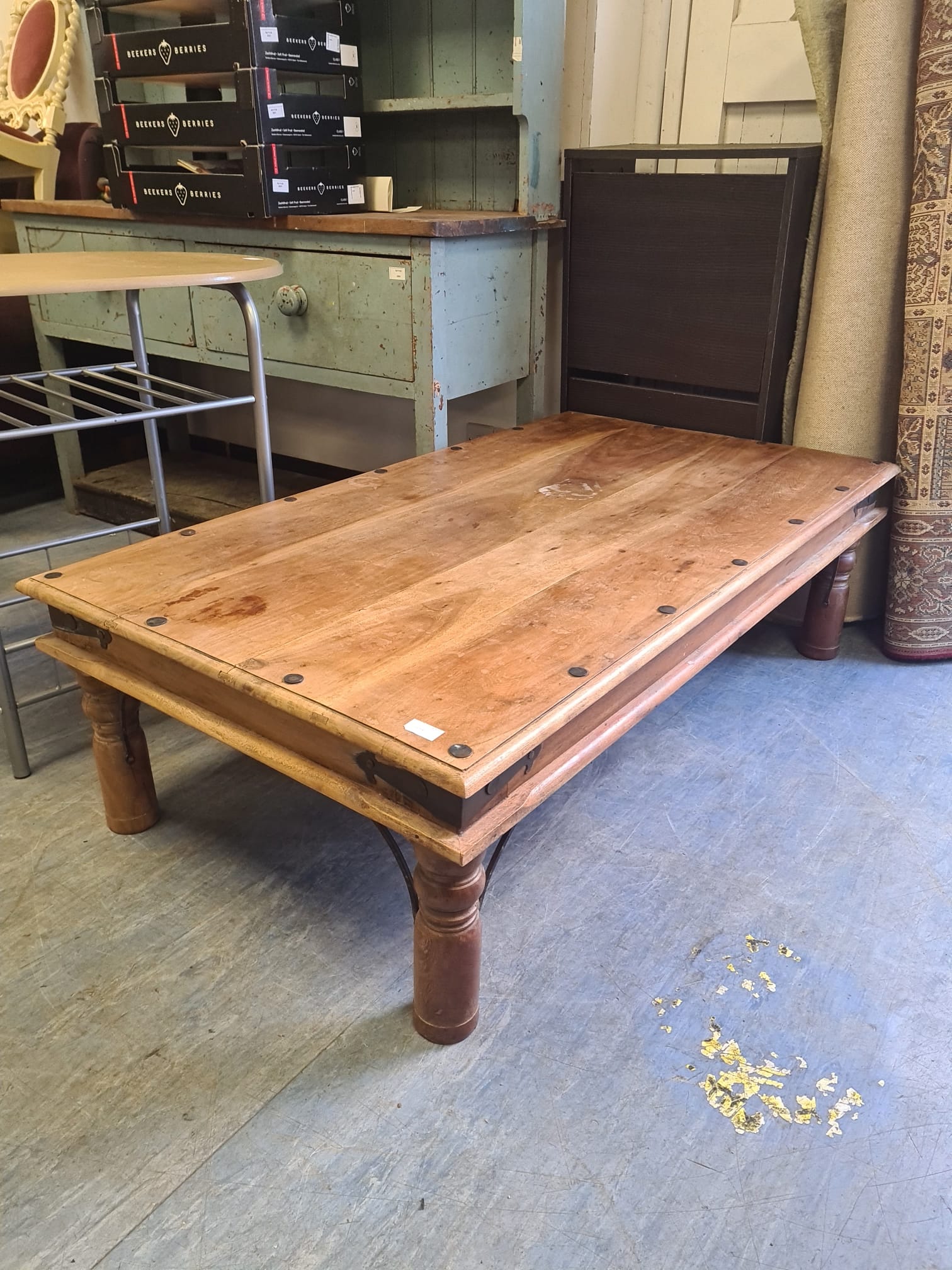 This is a substantial coffee table crafted from Indian oak, exhibiting a rustic aesthetic. The table features a thick, solid wood top with visible grain and character, supported by turned legs. Its robust construction and warm tones suggest a farmhouse or country style, adding a touch of vintage charm to any living space. The table’s substantial size makes it ideal as a focal point in a living room or family room.