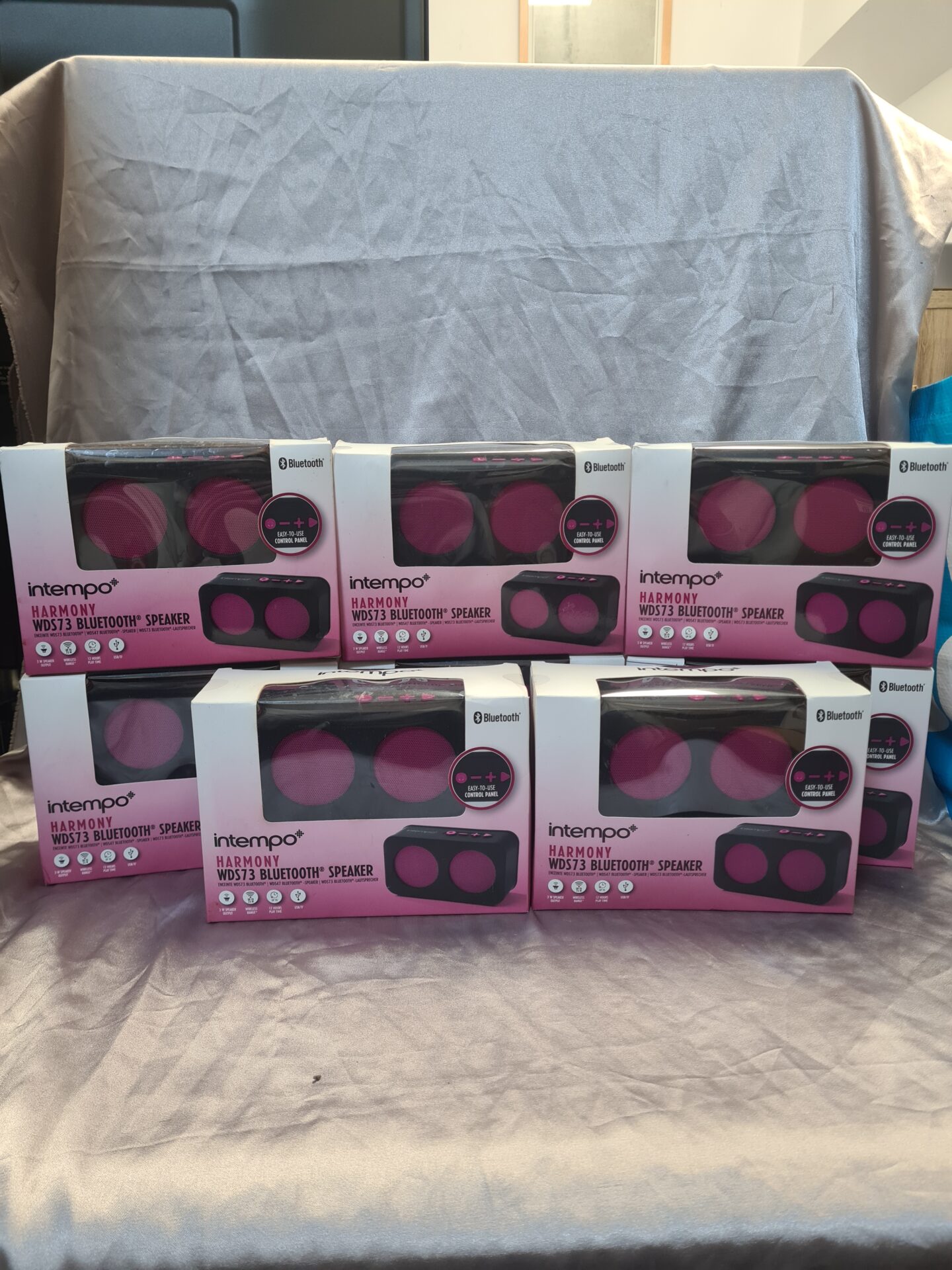 This lot comprises eight Intempo Harmony WDS73 Bluetooth speakers. These speakers are designed for wireless audio playback, offering a convenient solution for enjoying music or podcasts. The design is compact and portable, intended for easy placement and movement around a home or for use outdoors.