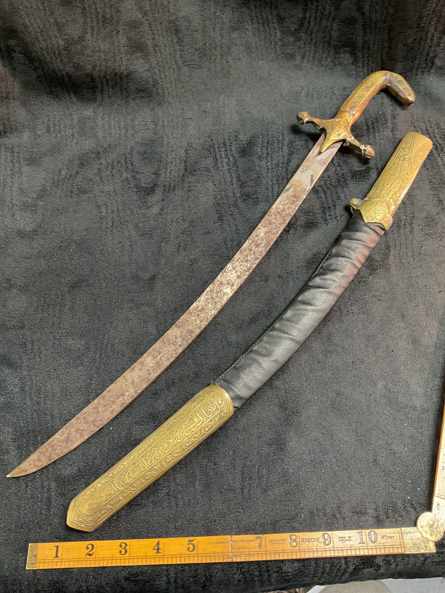 The sword displays signs of age and wear consistent with its likely age and use. The blade shows some patina and minor imperfections, while the hilt exhibits wear to the decorative elements. Despite these signs of age, the sword remains a fascinating example of Islamic craftsmanship and would be of interest to collectors of antique weaponry, Islamic art, or historical artifacts.
