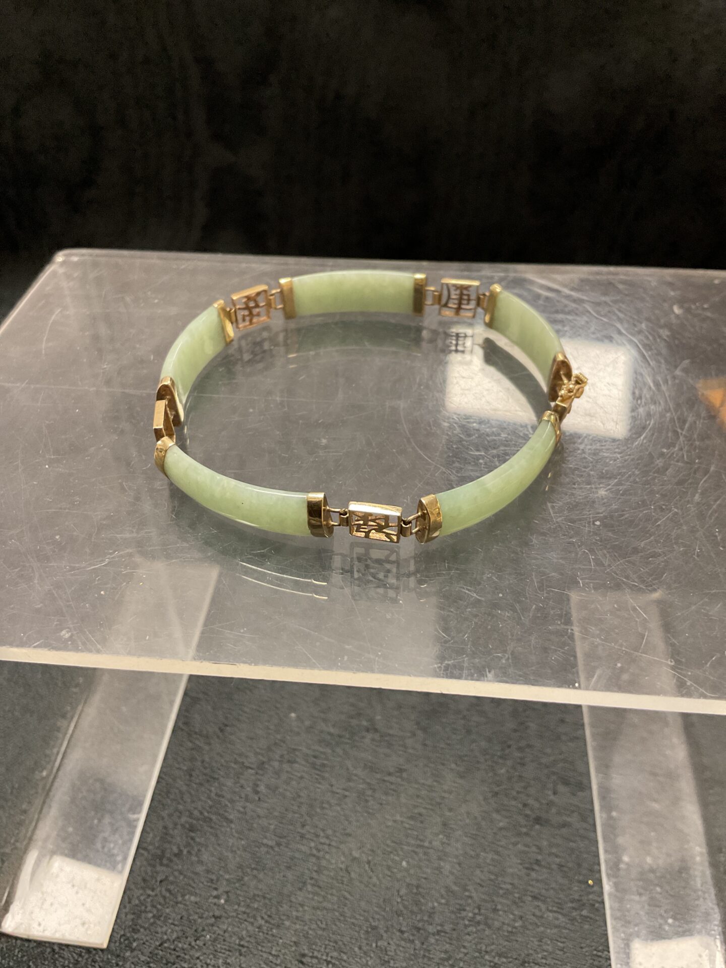 This bracelet presents as a well-maintained vintage piece, showing signs consistent with age and previous wear. The jade and gold remain securely set within the links, and the clasp functions as intended. This bracelet would appeal to collectors of vintage jewellery, Asian art, or those seeking a unique and culturally rich accessory.