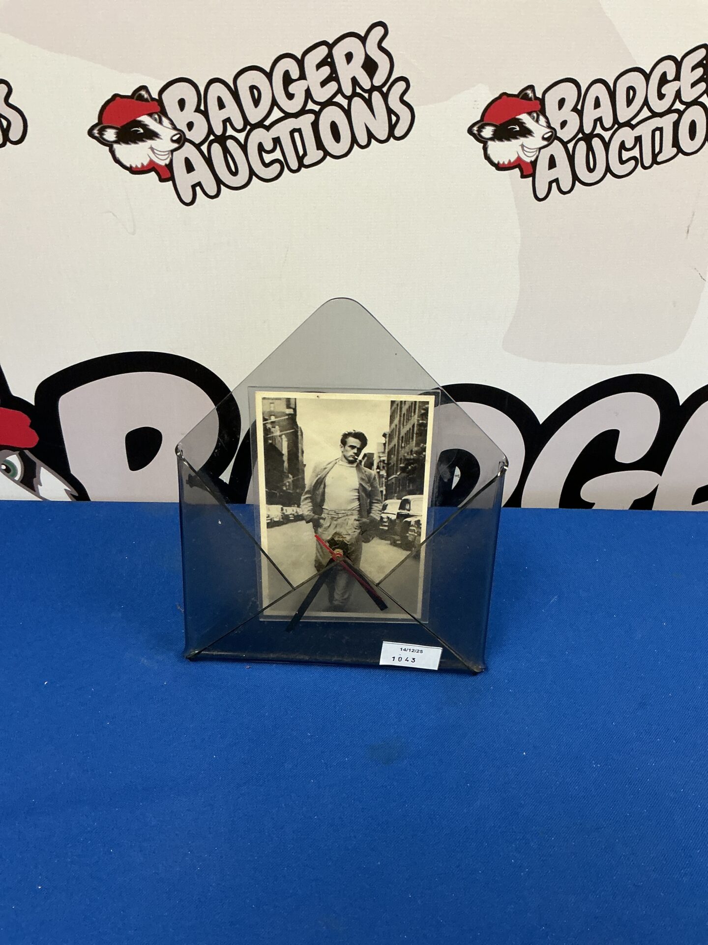 This vintage James Dean postcard clock is a unique piece of Hollywood memorabilia. Featuring the iconic actor, this mid-century modern clock adds a touch of classic style to any room. A must-have for collectors and fans alike!