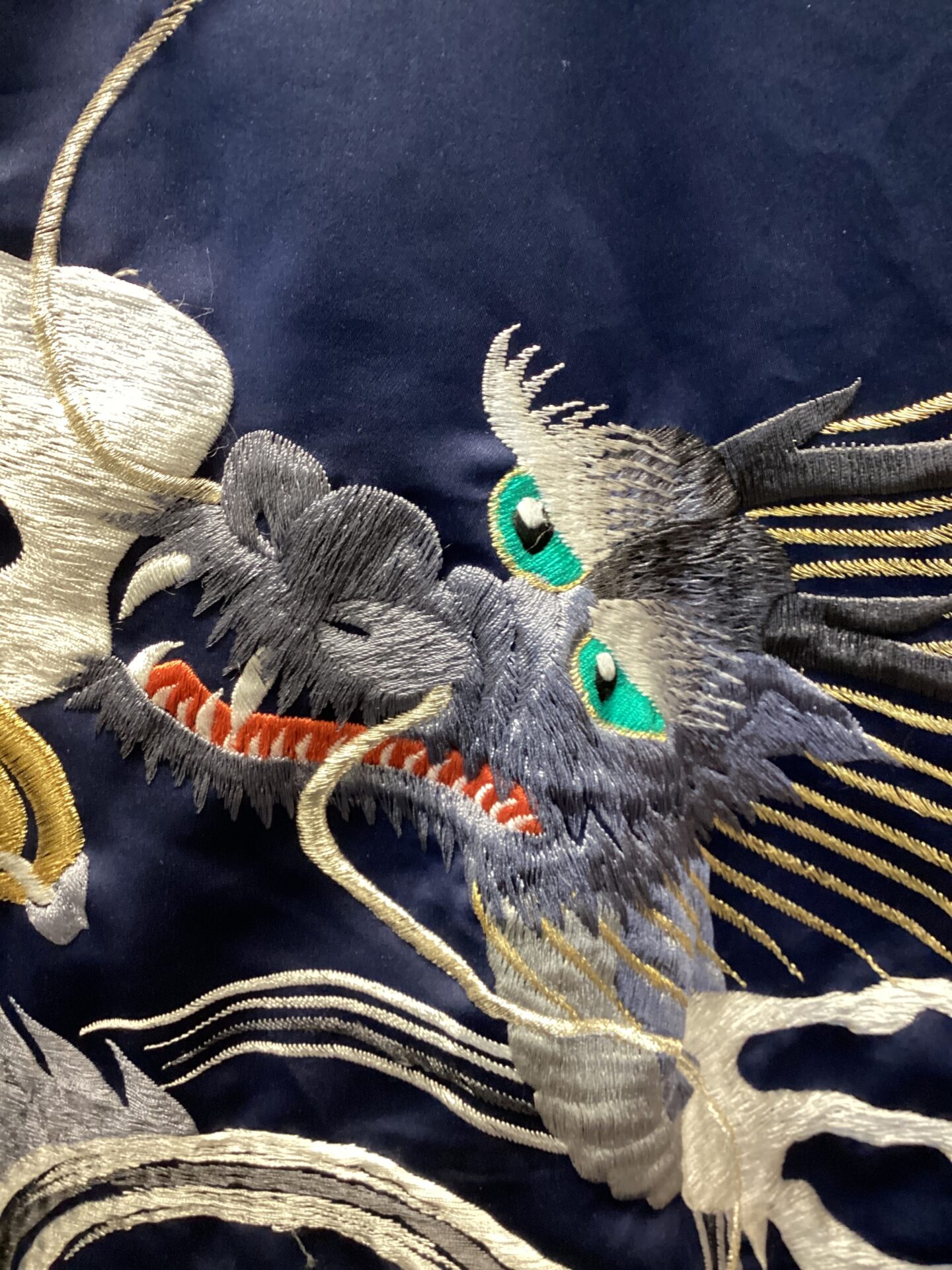 This striking kimono robe features a vibrant navy blue silk base, richly embroidered with a detailed golden dragon design. The dragon imagery extends across the back and front of the robe, incorporating swirling cloud patterns and intricate detailing. The robe’s cut suggests a traditional Japanese style, likely intended as outerwear or a ceremonial garment. The quality of the silk and the complexity of the embroidery indicate a high level of craftsmanship.