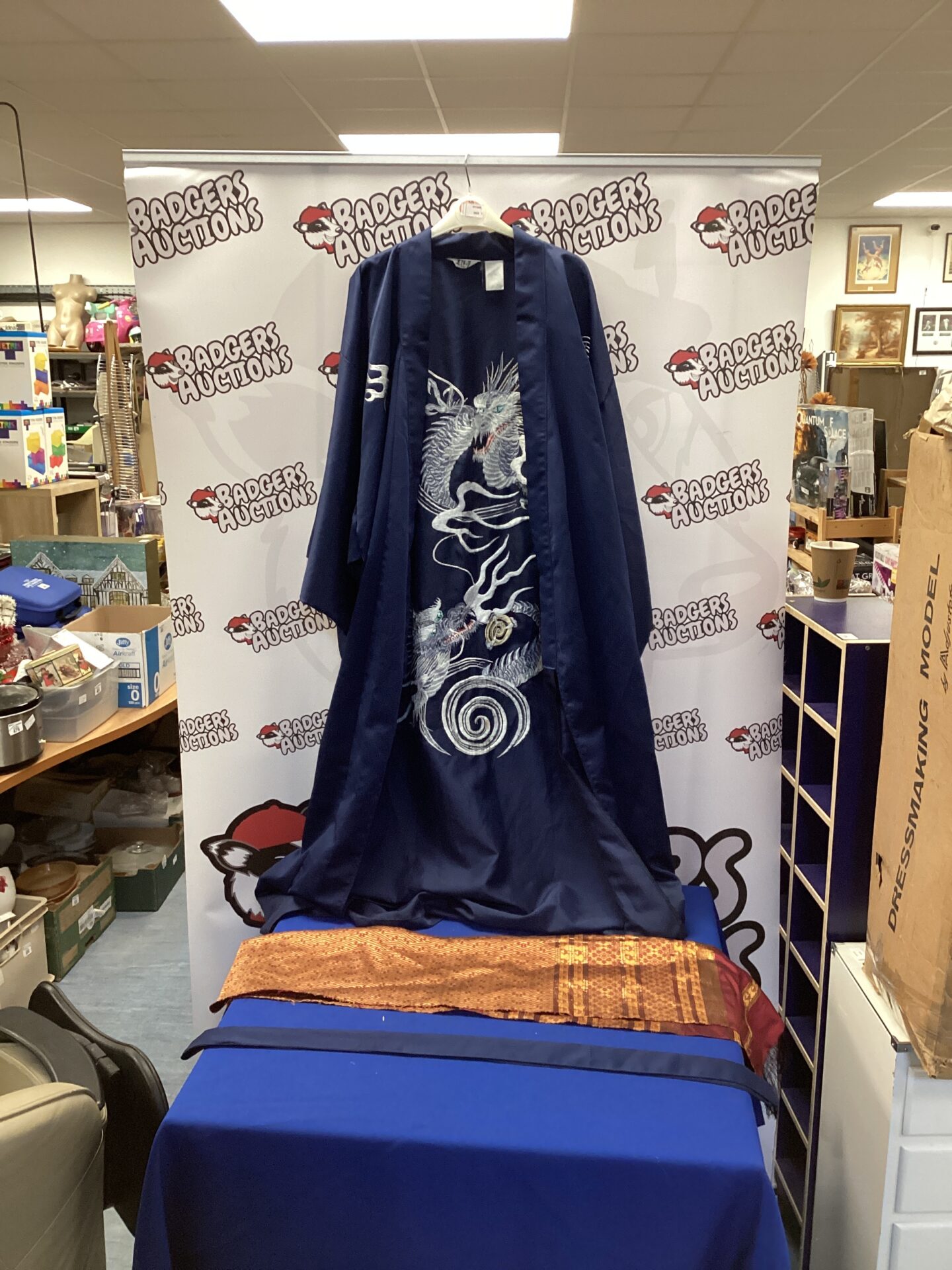 The robe presents with signs consistent with age and previous use, including minor creasing and potential wear to the silk. Despite this, the embroidery remains remarkably well-preserved, showcasing the skill of the artisan. This piece would appeal to collectors of Japanese textiles, vintage clothing enthusiasts, or those seeking a unique and decorative garment. The robe’s striking design and quality construction make it a desirable addition to any collection.