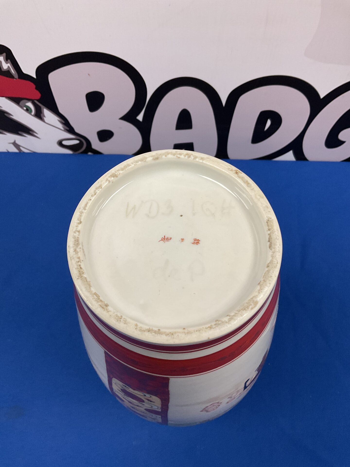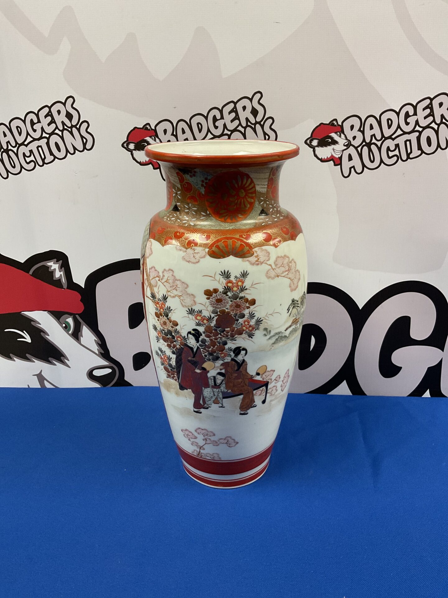 This is a beautifully hand-painted Japanese Kutani vase, dating from the Meiji period. The vase features intricate designs of figures amidst foliage, rendered in vibrant colours on a white background. The vase stands approximately 14.5 inches tall and is signed on the base, indicative of the artist or workshop responsible for its creation. The detailed artwork and quality of the porcelain exemplify the high standards of Japanese craftsmanship during this era.