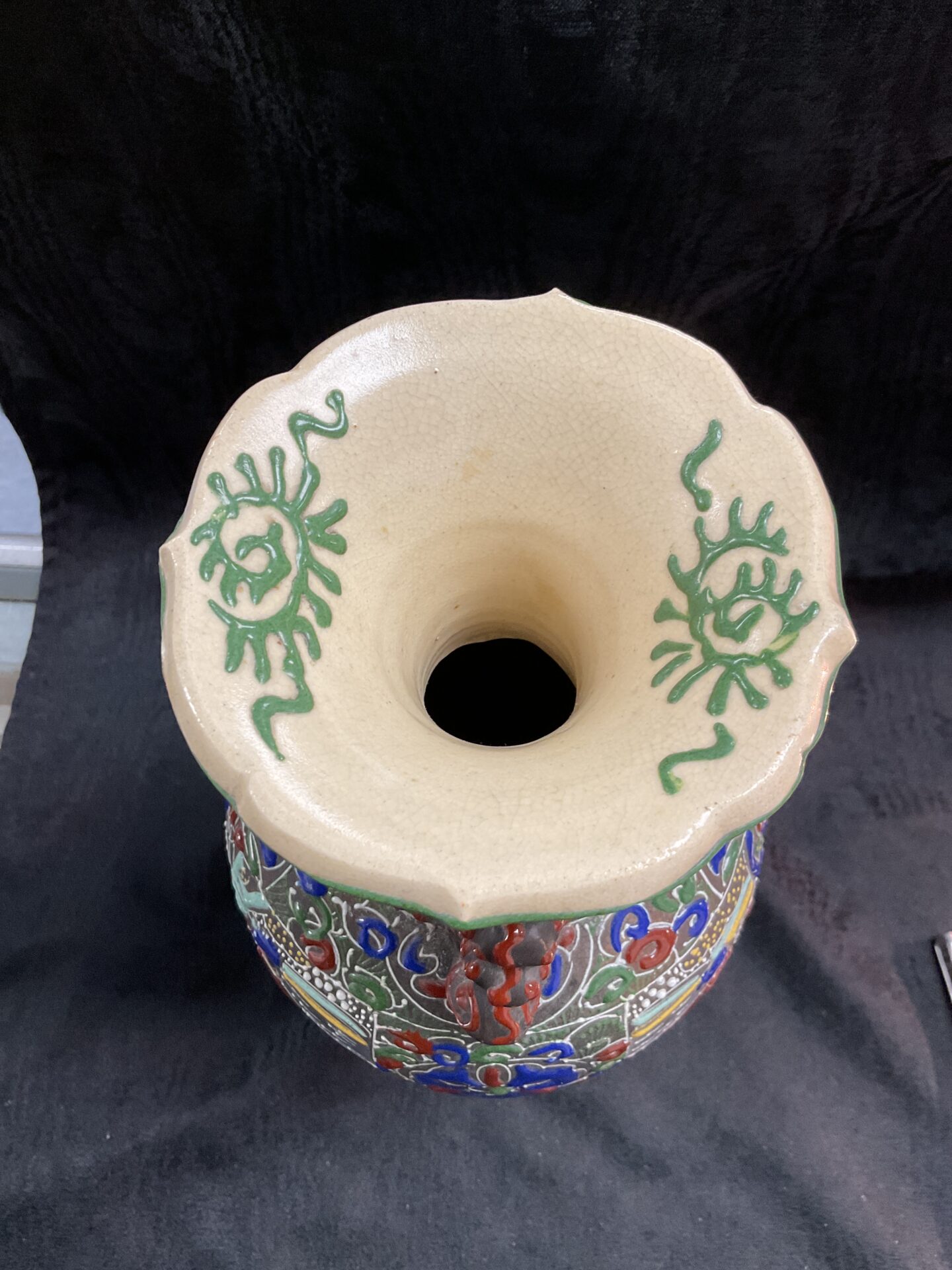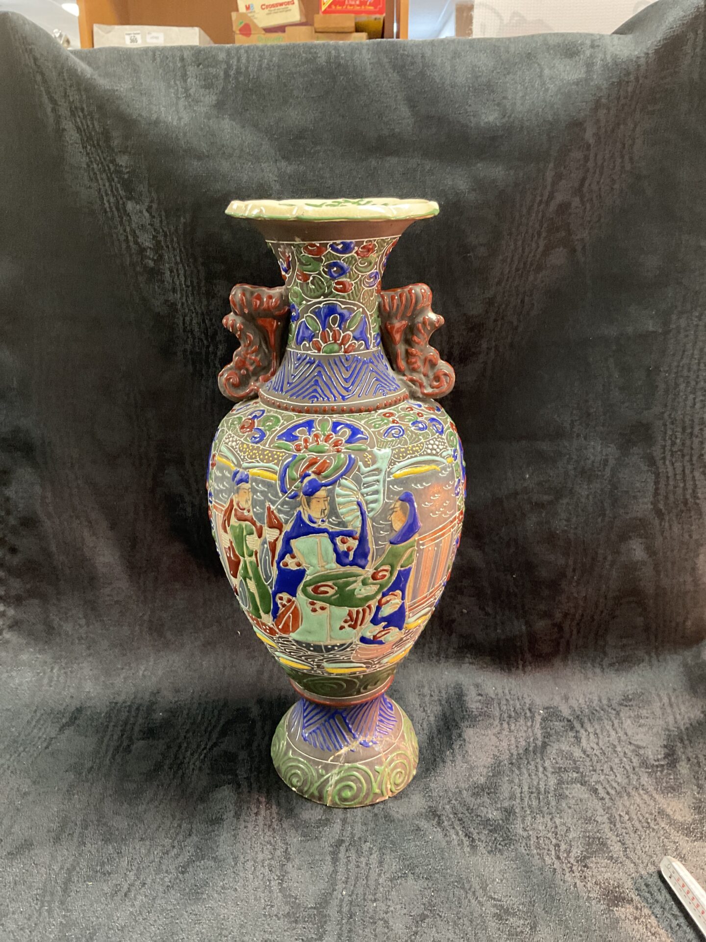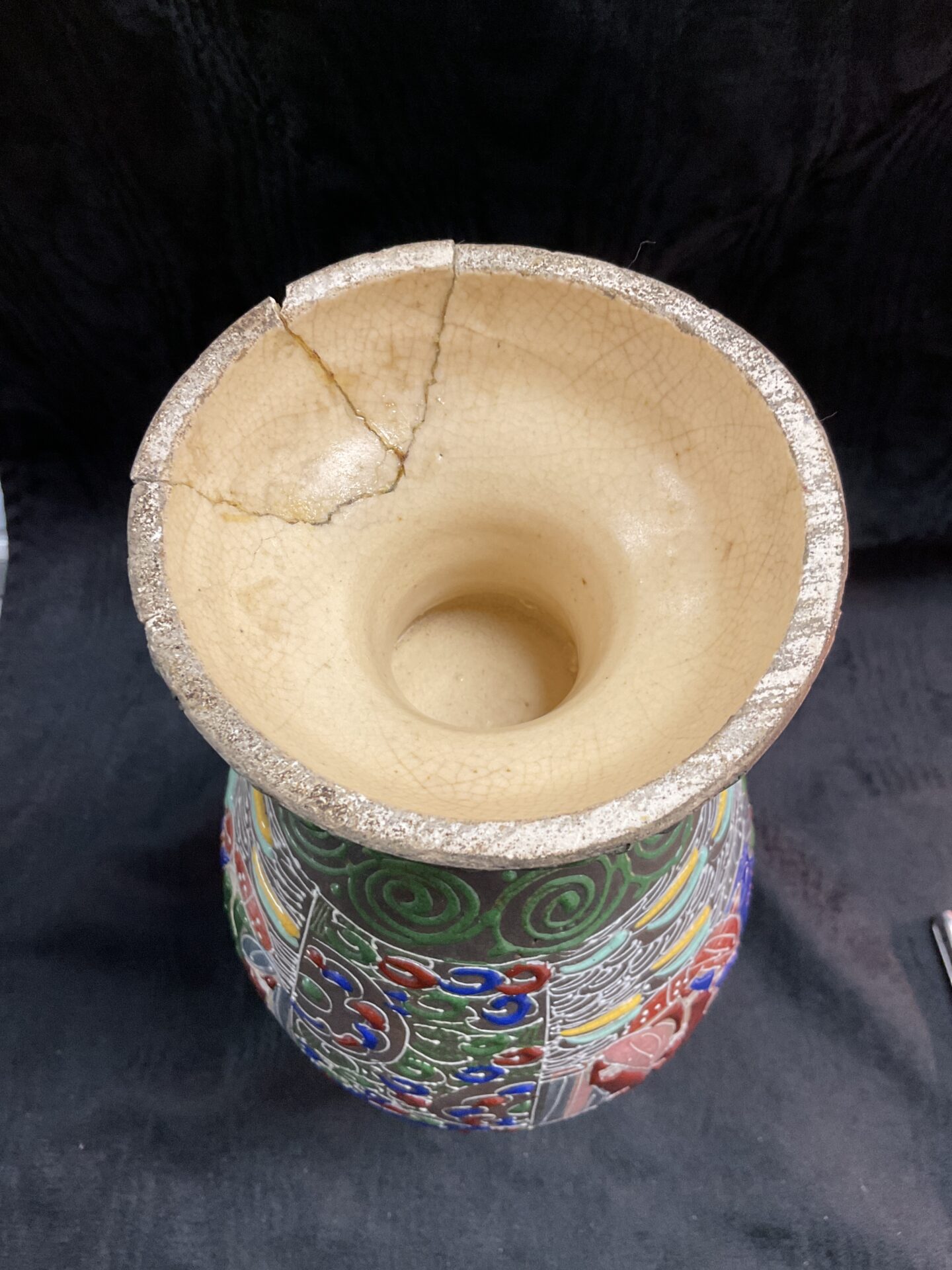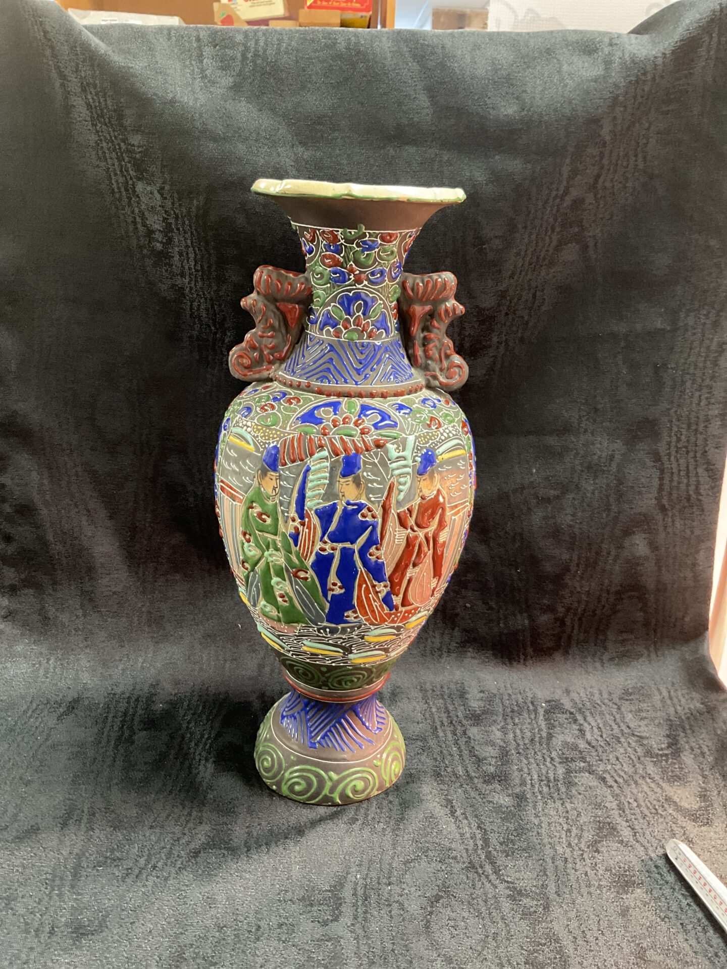 This antique Satsuma vase has undergone repair to the base, which is common for pieces of this age. Despite this repair, the vase retains its visual appeal and remains a desirable collectible for enthusiasts of Japanese art and ceramics. The vibrant colours and intricate details are well-preserved, making it a striking decorative piece. Collectors appreciate Satsuma ware for its historical significance, artistic merit, and the skill of the artisans who created it.