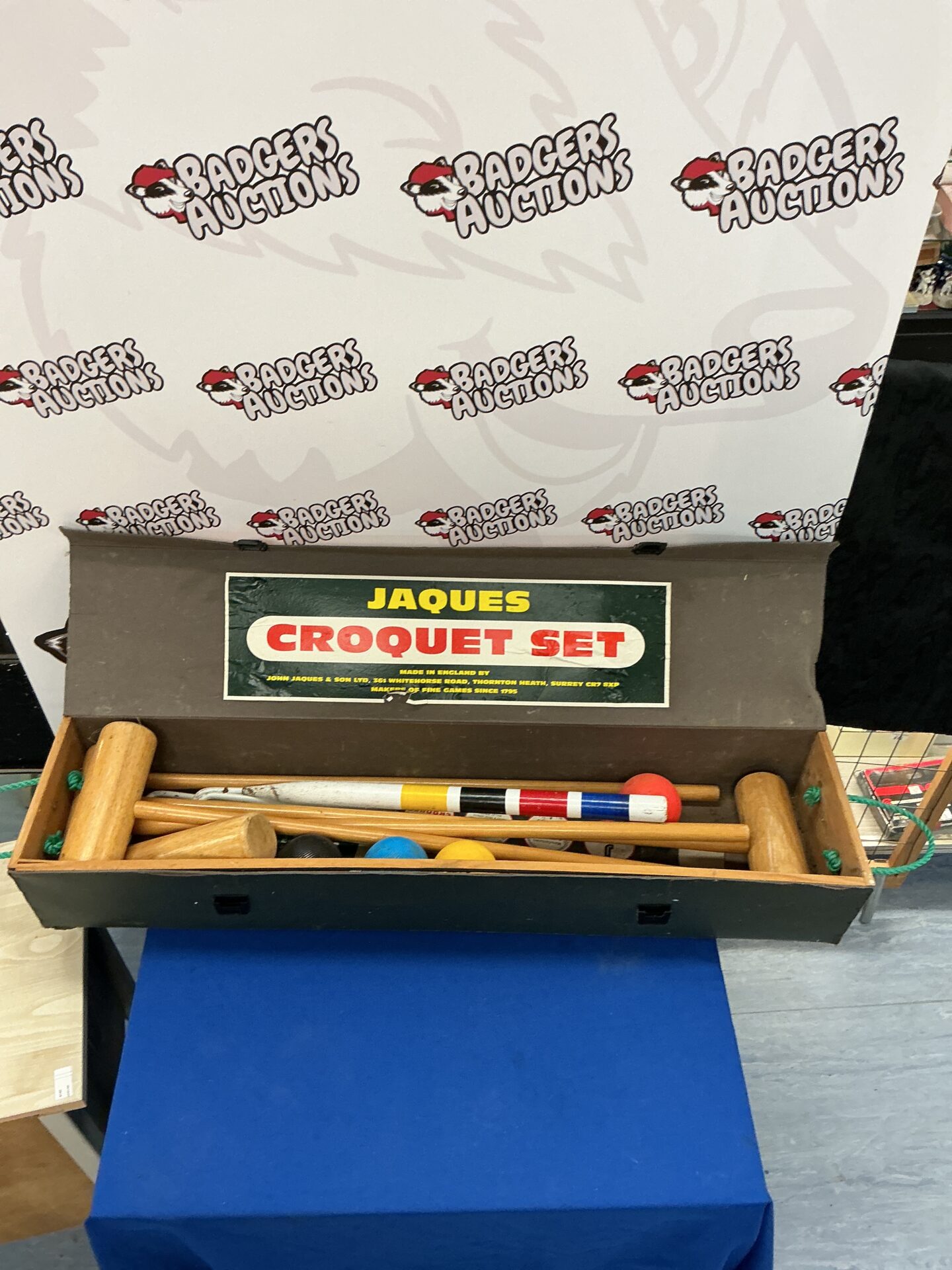 This Jaqueline Croquet Set is a complete vintage garden game, perfect for family fun. Contained within a sturdy box, the set includes mallets, balls, hoops, and stakes for hours of outdoor entertainment. A charming addition to any garden or a delightful collectible for enthusiasts.
