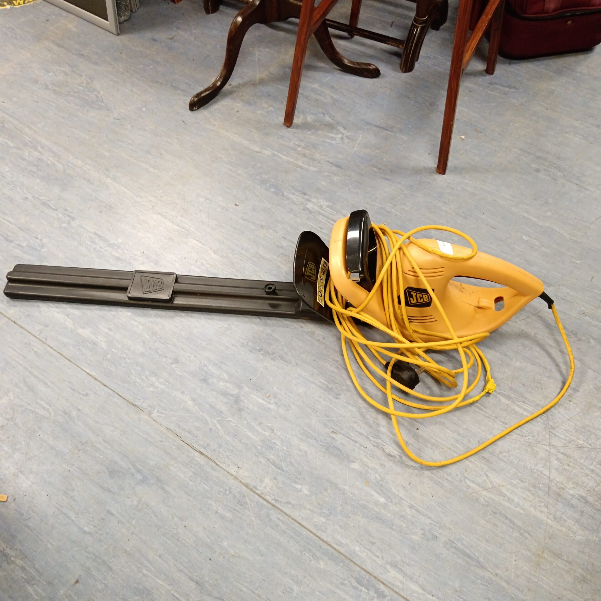 This JCB electric hedge cutter is presented for consideration by collectors and enthusiasts. The item shows signs of use and wear consistent with age and prior use. It is offered as a collectible or for restoration, and its operational status is not represented.