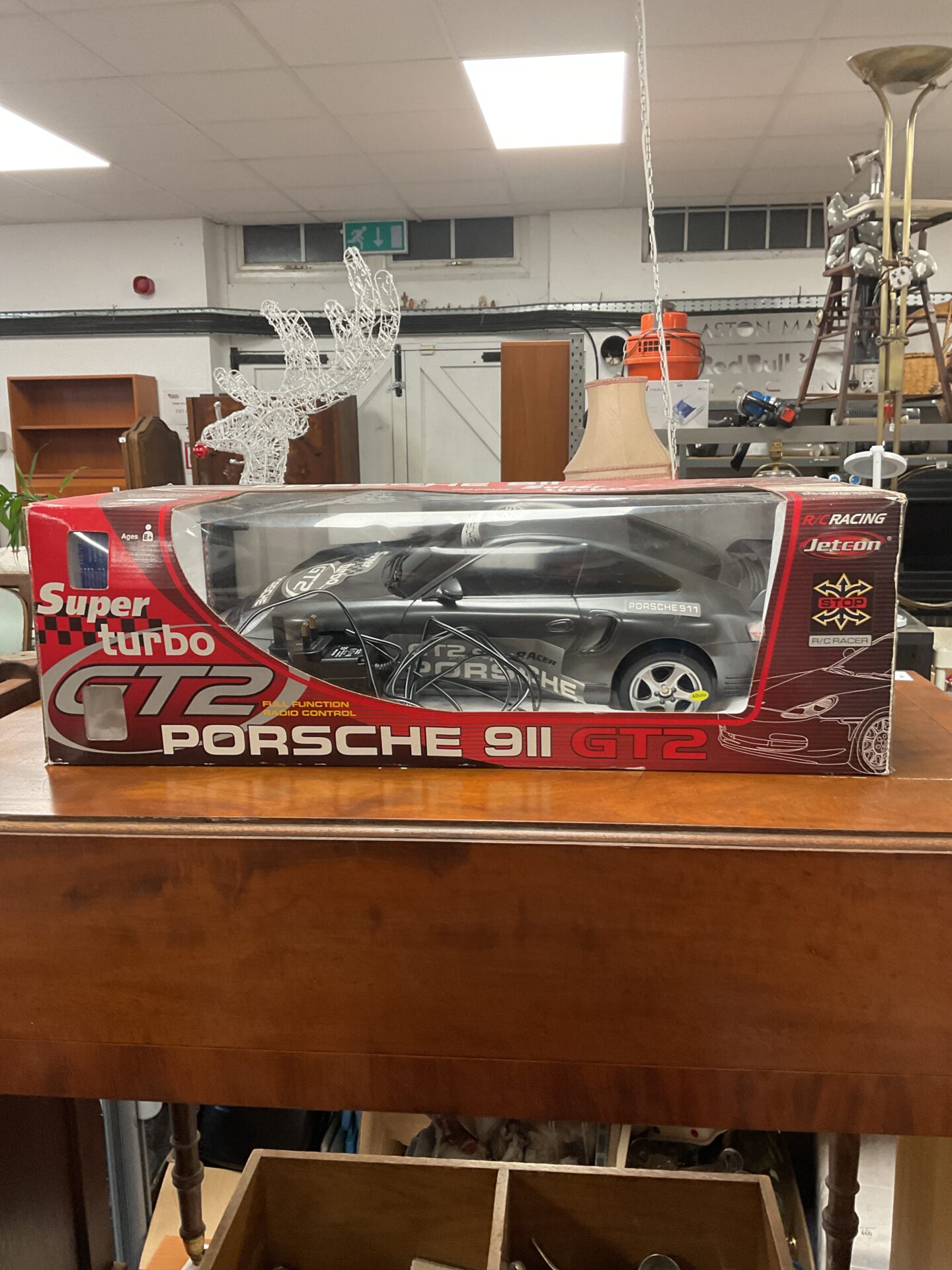 This is a Jetcon Super Turbo Porsche 911 GT2 radio controlled car. The model is styled after the iconic Porsche 911 GT2, featuring a sleek design and detailed bodywork. It is a vintage radio controlled vehicle, likely from the late 20th century, and represents a classic era of RC technology.
