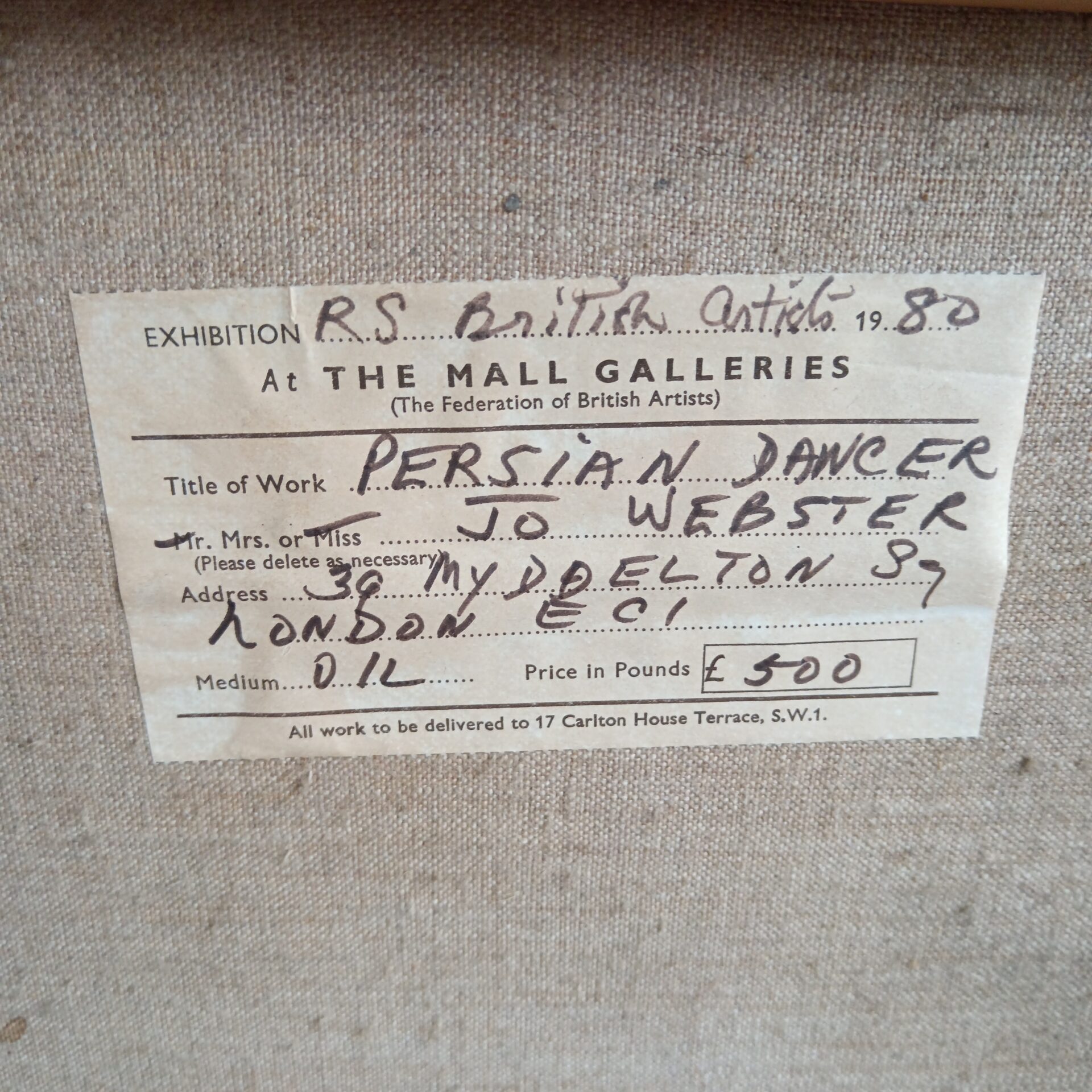 This is a striking oil painting by British artist Jo Webster, titled “Persian Dancer”, completed in 1992. The artwork depicts a beautiful woman in traditional dress, rendered with expressive brushstrokes and a rich colour palette. The composition is dynamic, capturing the grace and movement of a dancer, and the painting is signed and dated on the verso, along with a label indicating its exhibition at the Mall Gallery.