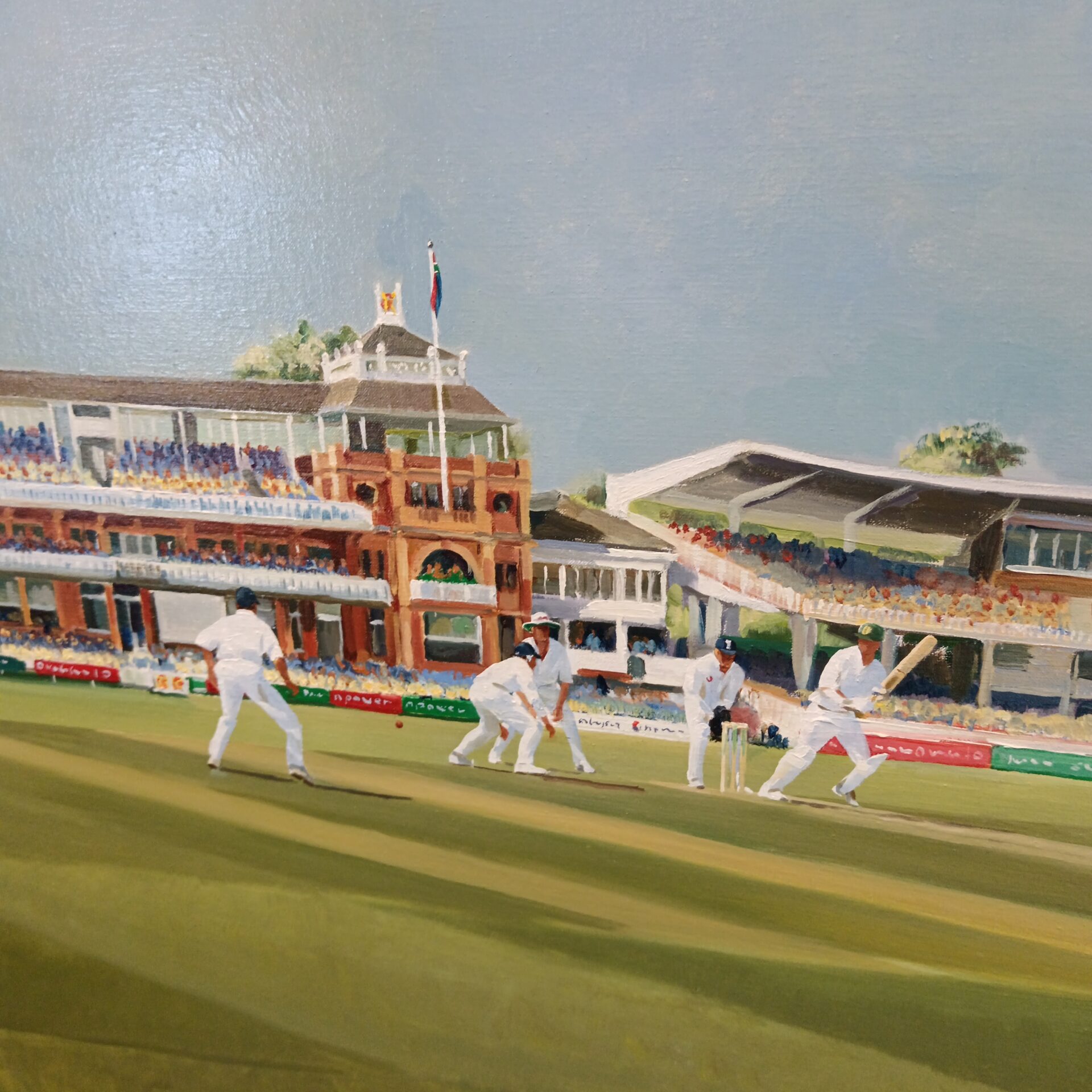 Original oil painting by Jocelyn Galsworthy, capturing a 2003 England vs South Africa test match at Lord’s Cricket Ground. This vibrant artwork depicts the action on the field and the atmosphere of the iconic ground, signed and dated by the artist. A unique piece for cricket enthusiasts and art collectors alike.