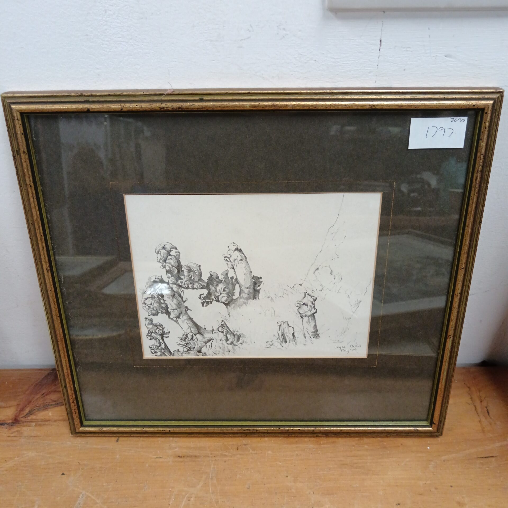 This is a pencil drawing by Joyce Curtis, created in 1979. The artwork depicts intricate tree roots, likely inspired by the landscape at Stonehill. The style is detailed and realistic, showcasing Curtis’s skill in botanical and landscape art. The drawing is framed, enhancing its presentation and protecting the artwork.