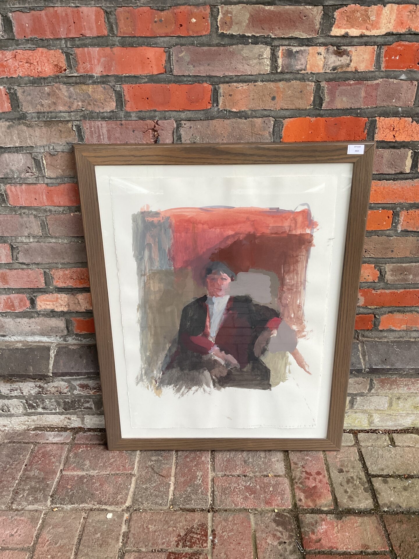 This is a large oil painting depicting a judge, rendered in a loose, expressive style. The artist utilizes broad brushstrokes and a muted palette to capture the subject’s dignified presence. The painting is framed, enhancing its presentation and providing a finished look. The artist’s signature is visible, adding to the piece’s provenance and collectibility.