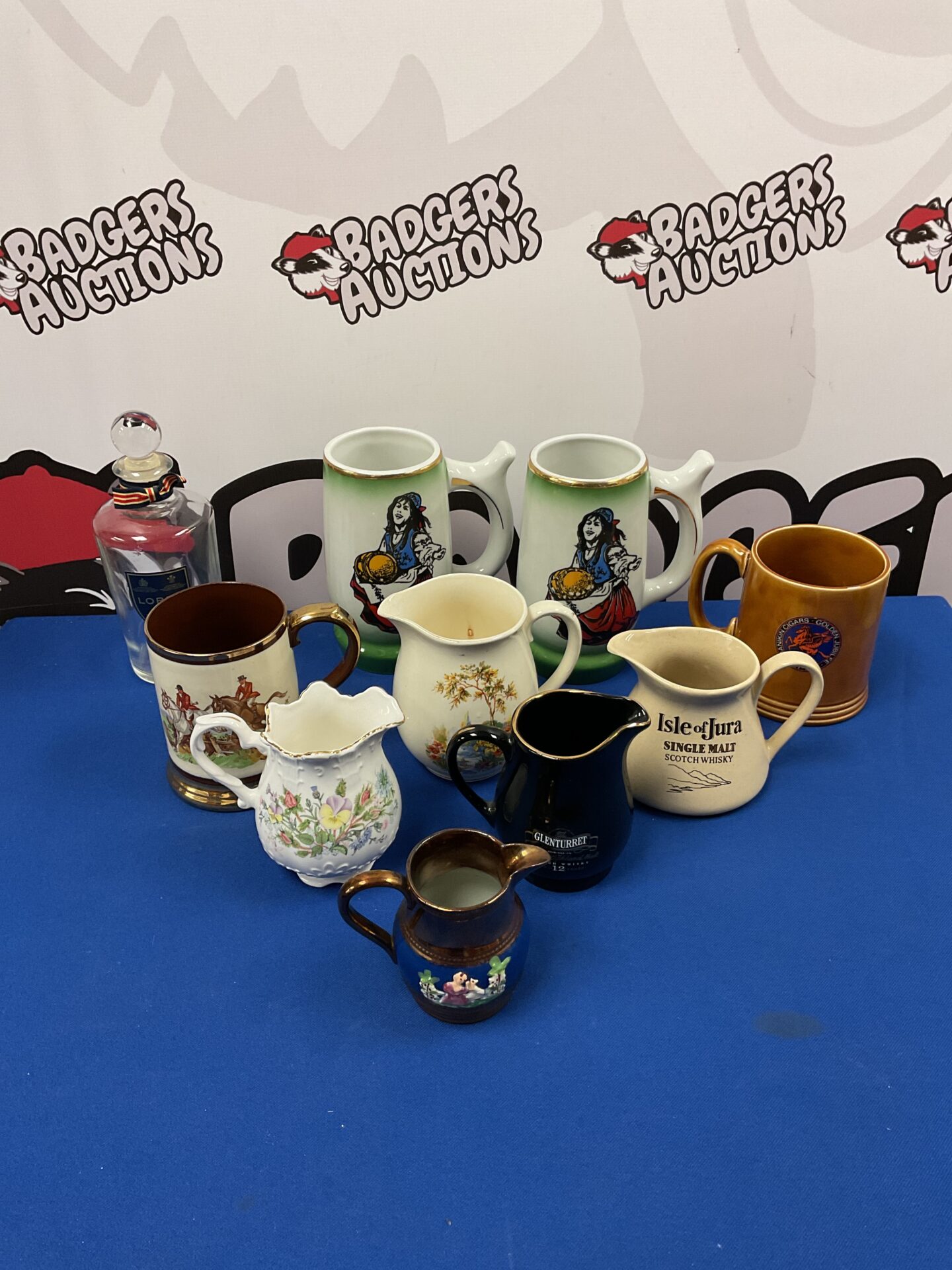 This lot comprises a collection of ceramic jugs and tankards, showcasing a variety of styles and designs. A notable piece is the Isle of Jura scotch whiskey jug, featuring branding and imagery related to the distillery. The collection also includes a decorative tankard and a unique glass bottle, likely originally containing Lords cologne, adding to the diverse nature of this grouping.