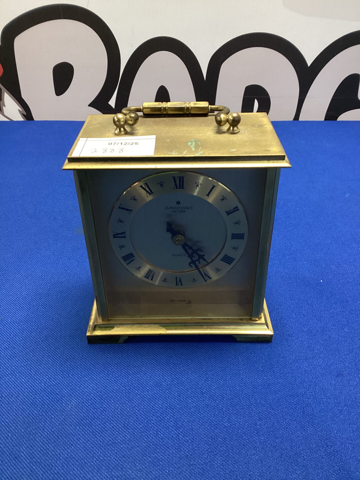This is a Junghans Meister quartz mantle clock. The clock features a gold-toned case with a classic design, suitable for display on a mantlepiece, desk, or shelf. The clock face is clean and easy to read, and the quartz movement ensures accurate timekeeping.